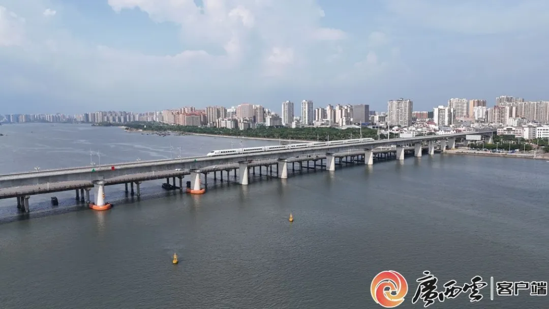 2023年建成通车全国首条直通中越边境城市的防东铁路。图为动车通过防城港跨海大桥一幕。记者 苑长军 摄