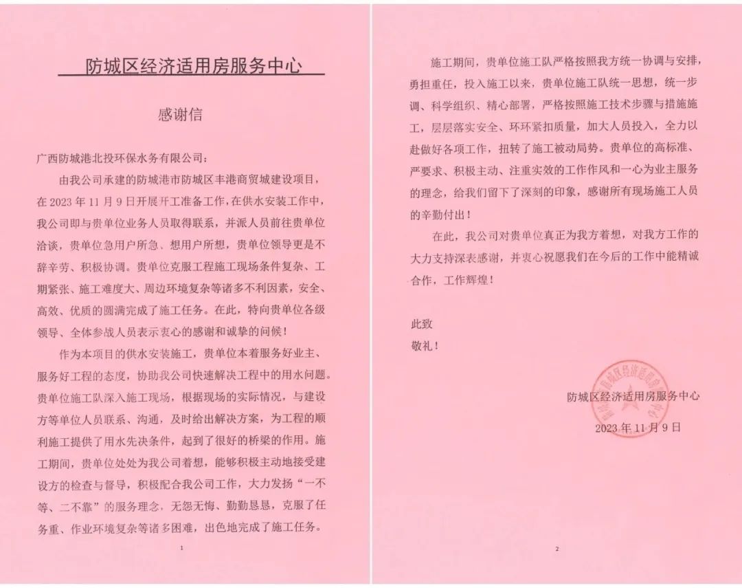 就在去年11月,防城港市防城区经济适用房服务中心将一面锦旗、一封感谢信送到了营管中心,锦旗上的“服务热情、高效廉洁,心系群众、排忧解难”话语感谢营管中心提供的优质服务。这面锦旗、这封感谢信,对营管中心党员干部职工来说,传达的不仅是一份感谢、一份肯定,更是一份责任、一种鞭策。近年来,营管中心积极主动对接临港工业区100余家大中型企业、物业小区,搭建起与用户顺畅无阻的沟通桥梁,得到了群众的高度认可,累计收到用户送来感谢信5封、锦旗6面。