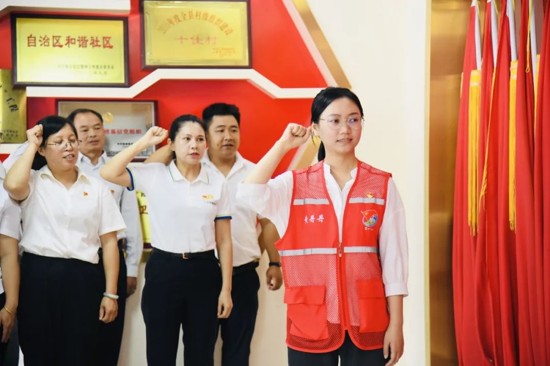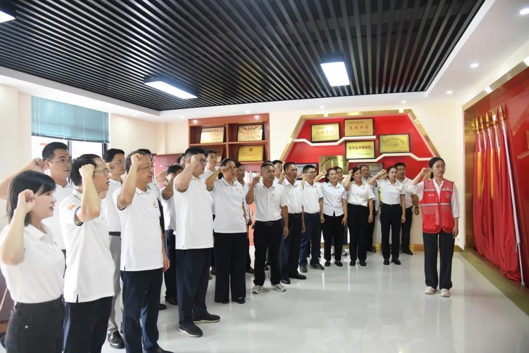 在庄严的党旗前,全体人员重温入党誓词,铿锵誓言响彻展厅。