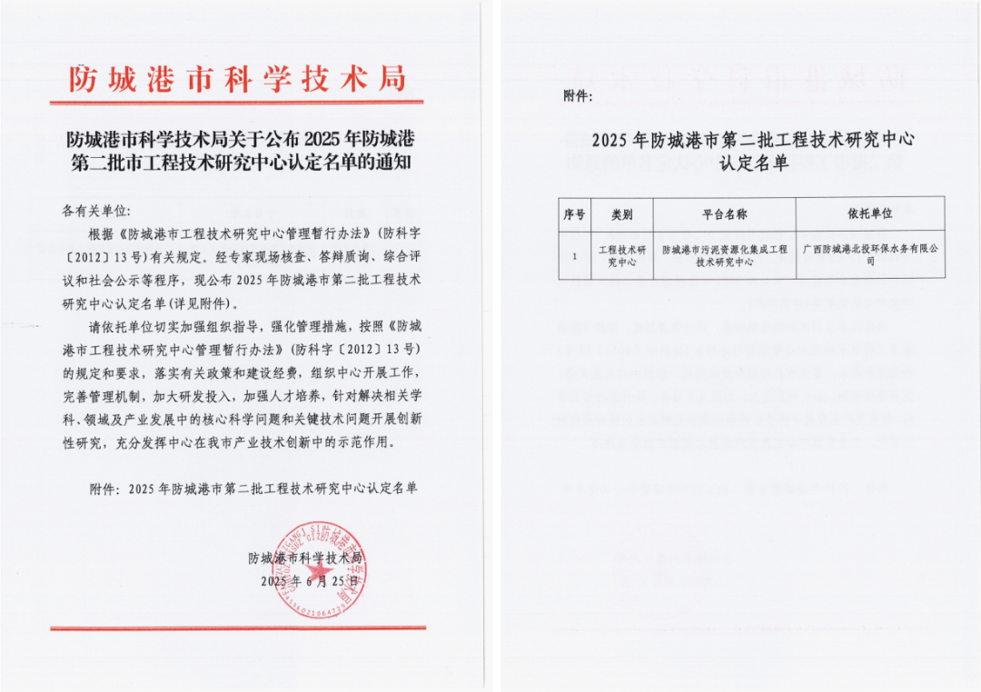 近日,防城港市科学技术局正式公布2025年第二批市工程技术研究中心认定名单,由环保水务集团牵头建设的“防城港市污泥资源化集成工程技术研究中心”(以下简称“中心”)成功入选。