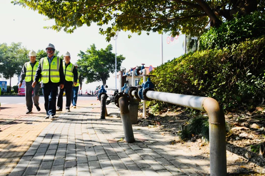 中国—东盟马拉松赛事期间,技术人员对赛道周边的供水管网进行细致巡查。