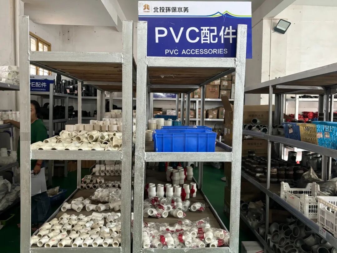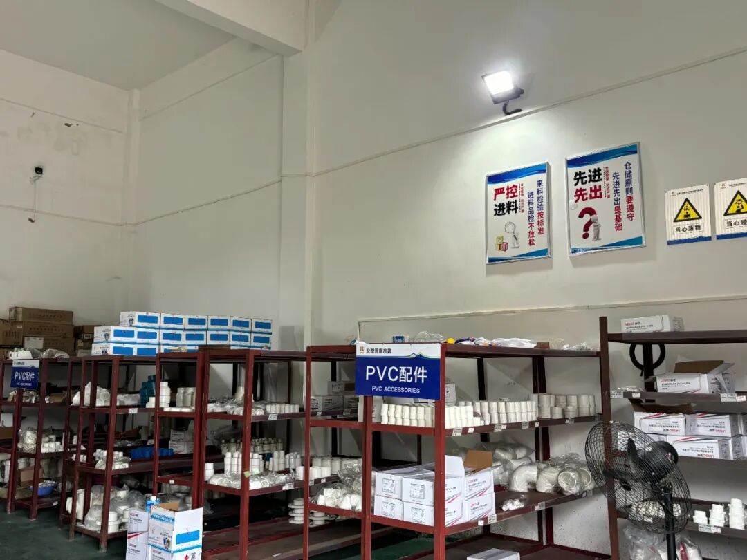 走进改造后的仓库,绿色地坪漆铺设的地面整洁明亮,配合科学规划的货架布局,PVC配件、金属管件等物资按品类分区存放,原本拥挤的存储空间变得井然有序,空间利用率显著提升。仓库通风与照明系统同步升级,节能LED灯具实现光线均匀覆盖,良好的通风条件确保空气流通,为员工打造了明亮舒适的作业环境。