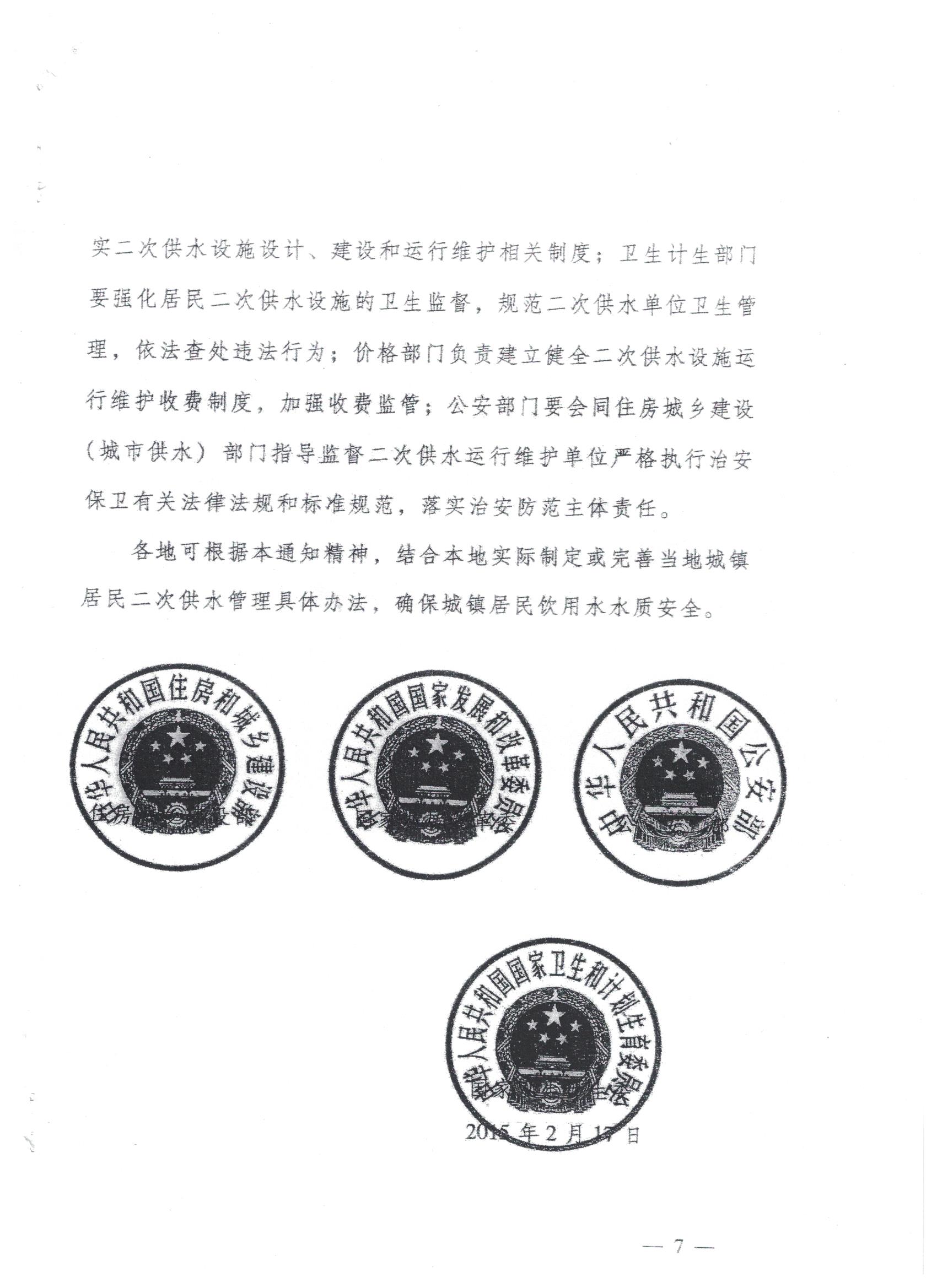 国家住建部、发改委、公安部、卫计委《关于加强和改进城镇居民二次供水设施建设与管理确保水质安全的通知》(建城〔2015〕31号).rar