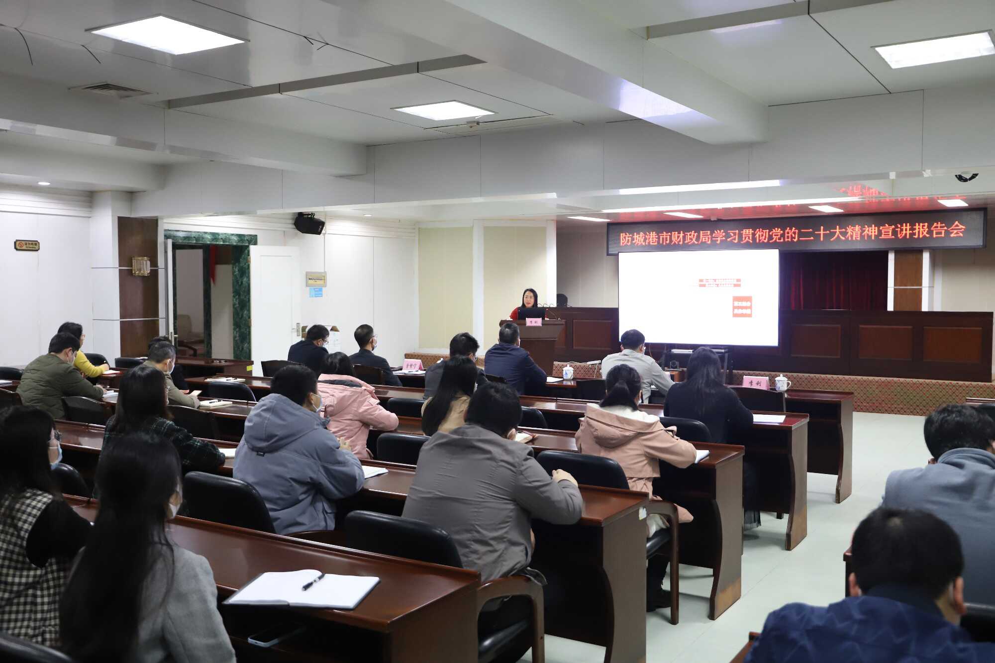 2月9日,市财政局举办学习贯彻党的二十大精神宣讲报告会,邀请市直机关讲师团成员、防城港市大数据和行政审批局投资项目审批科科长李利进行宣讲,推动学习宣传贯彻党的二十大精神在财政系统走深走实,以理论学习成效推动财政金融各项工作提质增效。市财政局在家领导班子成员、全体党员干部参加了报告会。