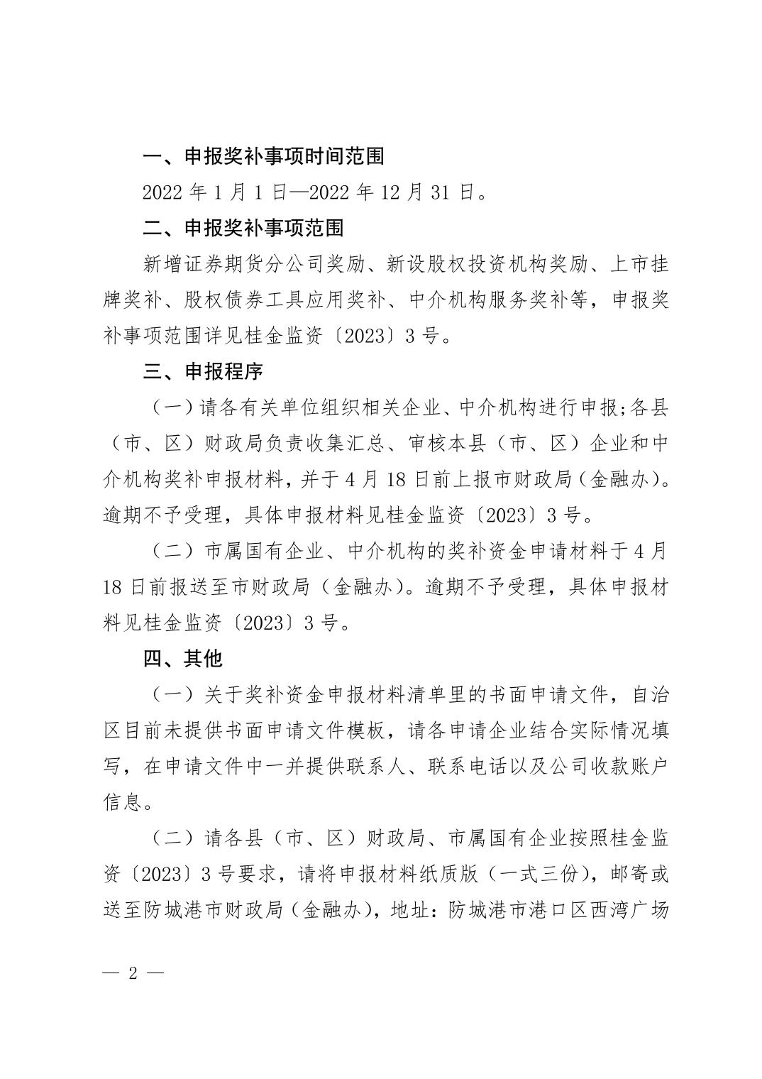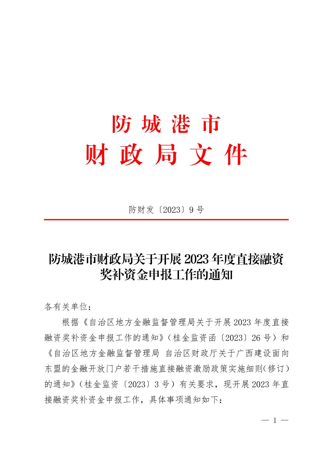 防城港市财政局关于开展 2023 年度直接融资奖补资金申报工作的通知