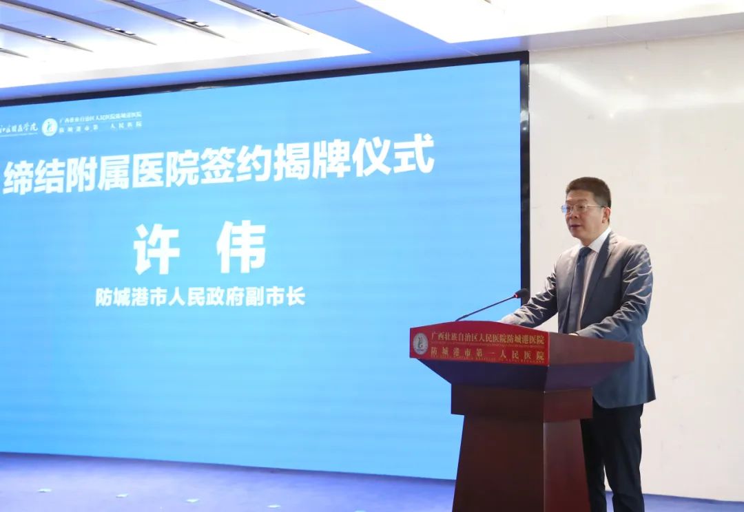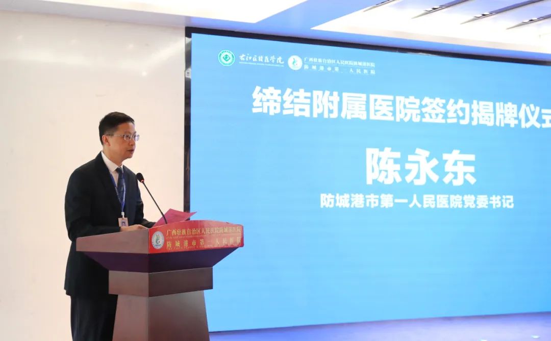 市委常委、副市长陈光炯对双方合作表示热烈祝贺。他指出,近年来防城港市卫生健康事业发展成果显著,防城港国际医学开放试验区建设取得阶段性进展。右江民族医学院与防城港市第一人民医院通过校院合作,进一步统筹集聚资源,加快优势互补,推动校院协同创新发展,对于提升区域医疗中心服务能力和高水平建设防城港国际医学开放试验区具有十分重要的意义。这一合作将充分整合双方优质资源,推动双方在多领域的深入交流,实现优势互补、协同创新,共同推动医学教育、医疗服务和科研创新的深度融合与发展。