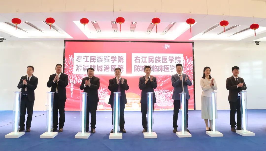 与会领导、嘉宾共同为“右江民族医学院附属防城港医院”“右江民族医学院防城港临床医学院”揭牌。