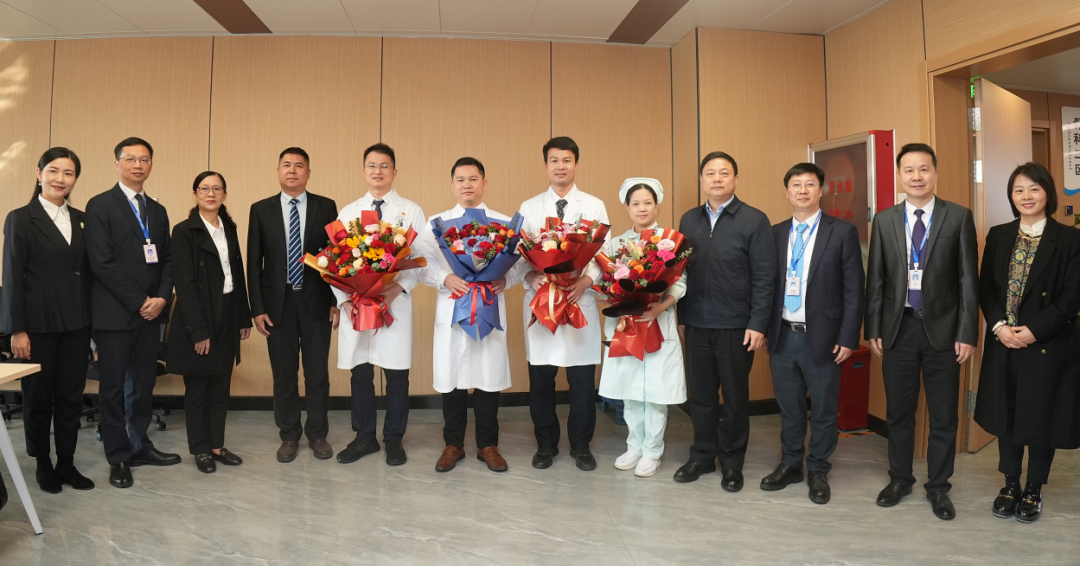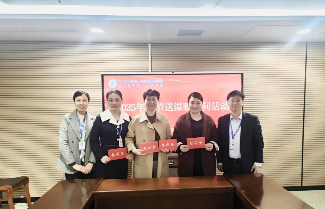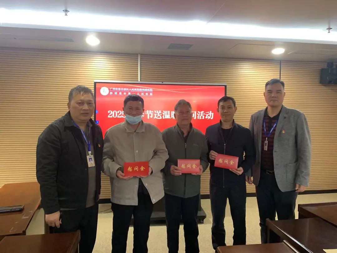 1月17日,自治区卫生健康委党组成员、副主任黎君君(右四),市卫生健康委党组书记、主任戴三军,广西壮族自治区人民医院副院长伍秋霞、叶琨以及我院院领导看望慰问了自治区人民医院派驻我院的专家代表,与他们进行亲切交谈,详细了解派驻专家们的工作和生活情况,为他们送去新春的祝福和关怀,勉励大家持续做好自治区级区域医疗中心建设工作,为人民群众的健康保驾护航。