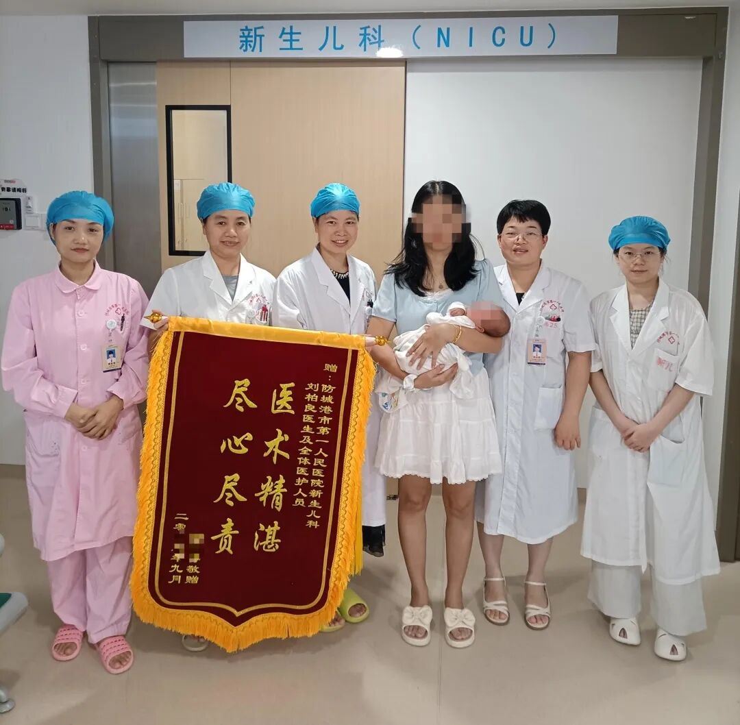 9月17日这一天(“闯闯”出生后3个月),返院常规体检,患儿家属激动地将一面写有“医术精湛、尽心尽责”的锦旗送到了科室,对新生儿科医护团队精湛的医术和无私的关爱表达了最崇高的敬意和最诚挚的感谢。这面锦旗,不仅是对医务人员过往工作的肯定,更是对我院新生儿科未来守护更多脆弱新生命的鞭策。