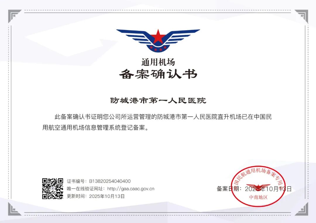 近日,防城港市第一人民医院直升机场正式通过民航行业备案,成为防城港市医疗系统首个取得备案资质的通用机场。