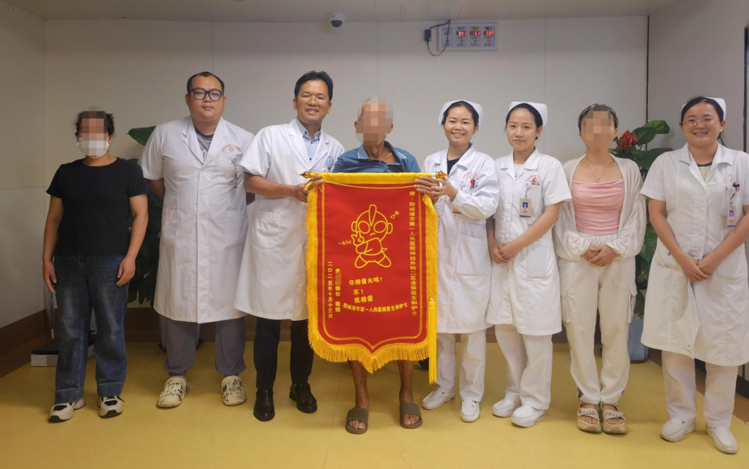 经过医护人员的精心治疗与悉心护理,老人的肺炎逐步得到控制,且成功苏醒。如今,他不仅能正常交流,还能自主迈步,最终顺利康复出院。为表达对医护人员的感激,患者家属制作了一面特别的锦旗,郑重地交到神经外科二区主任和护士长手中。
