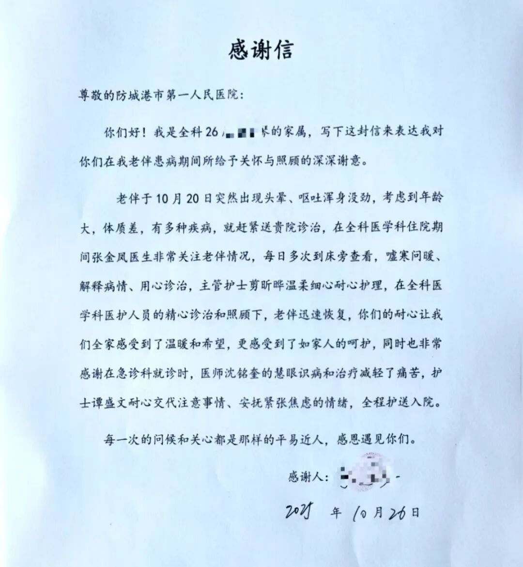 日前,我院急诊医学科收到一封饱含深情的感谢信。信中,患者家属详细讲述了老伴在我院急诊医学科、全科医学科就诊过程中,医护人员的专业救治与暖心服务,字里行间满是对我院医护人员的感激与敬意。