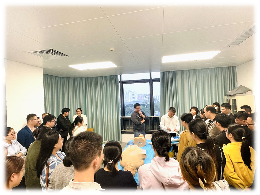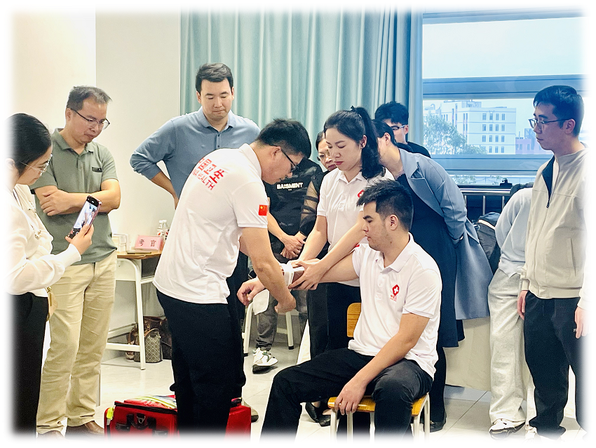 当日下午,在技能培训现场开展模拟急救场景实训。专家团队围绕心肺复苏、气胸处理、创伤患者止血包扎搬运及气道开放等基础操作,手把手指导学员规范动作、纠正偏差;针对颈椎骨折包扎转运、多人外伤检伤分类等复杂案例,组织学员开展应急处置推演,锤炼快速评估、分工协作与精准施救能力。现场学习氛围浓厚,互动交流热烈。