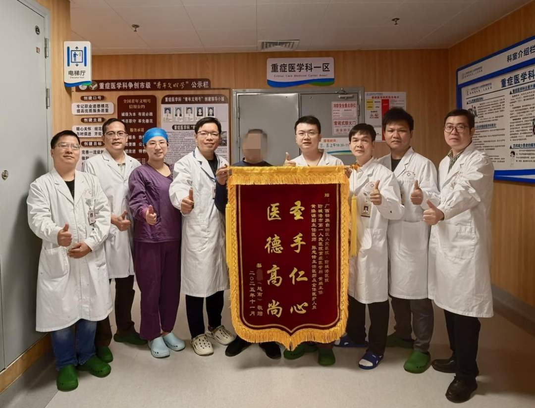 越南籍患者黎先生三周前因严重的河豚中毒命悬一线,经“1369生命直通车”生命接力转入我院救治得以苏醒。出院前,患者的家属将一面鲜红的锦旗送到了我院重症医学科医护人员手中,锦旗上“圣手仁心,医德高尚”的金色大字,无声地诉说着这个感人至深的救治故事。