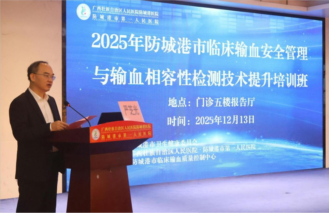 12月13日,由防城港市卫生健康委主办、我院与防城港市临床输血质量中心联合承办的2025年防城港市临床输血安全管理与输血相容性检测技术提升培训班在我院成功举办。市卫生健康委医疗应急科科长、医政科负责人高琨,我院副院长严芝光出席开班仪式。全市各级医疗机构输血科(血库)及临床用血科室负责人、业务骨干等100多人参加了培训班,开班仪式由我院输血科副科长马秋琼主持。