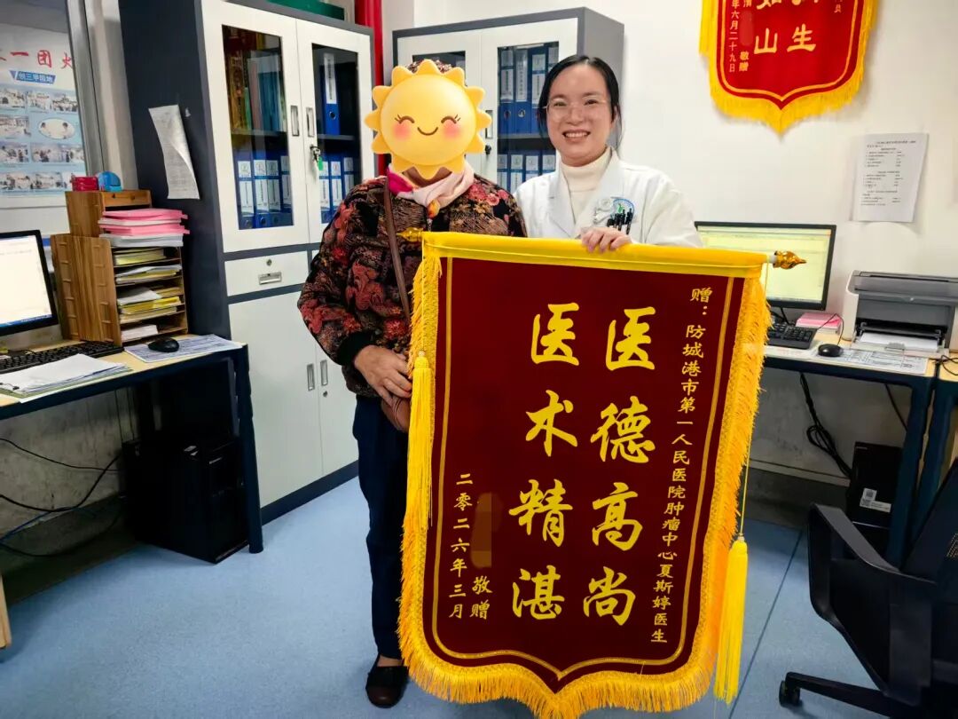 近日,我院防城院区肿瘤中心收到一面患者纪女士(化名)家属赠送的锦旗,红底金字的“医德高尚,医术精湛”八个大字,不仅承载着患者及家属的真挚谢意,更是对肿瘤中心医护团队专业诊疗与人文关怀的高度肯定。
