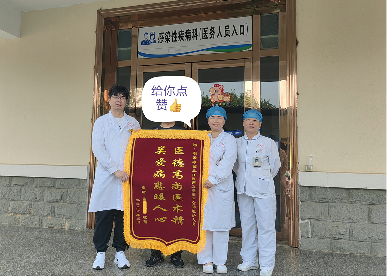 日前,一名患者与家属专程来到我院防城院区感染性疾病科,将一面印着“医德高尚医术精,关爱病患暖人心”的锦旗送到科室医护团队手中,以此感谢全体医护人员的精心诊疗与暖心照护。