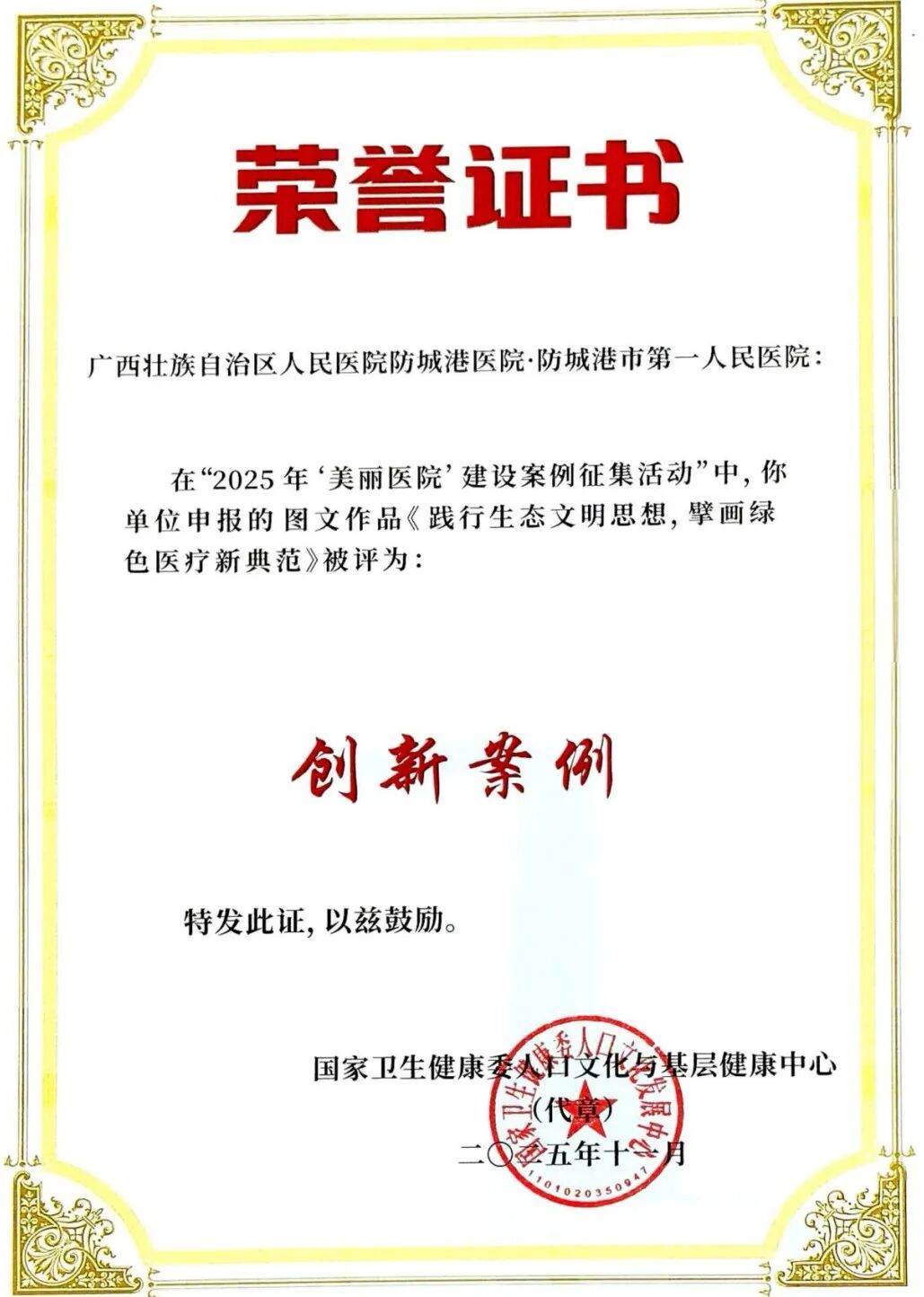 2025年11月,我院以节能为主题的相关案例荣获国家卫健委全国“美丽医院”建设创新案例奖。