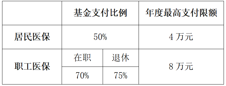 参保人员在定点医疗机构门诊发生的单列门诊统筹支付的医保药品费用,不设起付线,由医疗保险统筹基金和参保人员共同负担。其中居民医保的统筹基金支付比例为50%;职工医保的统筹基金支付比例为:在职人员70%、退休人员75%。设置年度最高支付限额,其中居民医保为4万元,职工医保为8万元,分别计入当地居民医保和职工医保年度最高支付限额。
