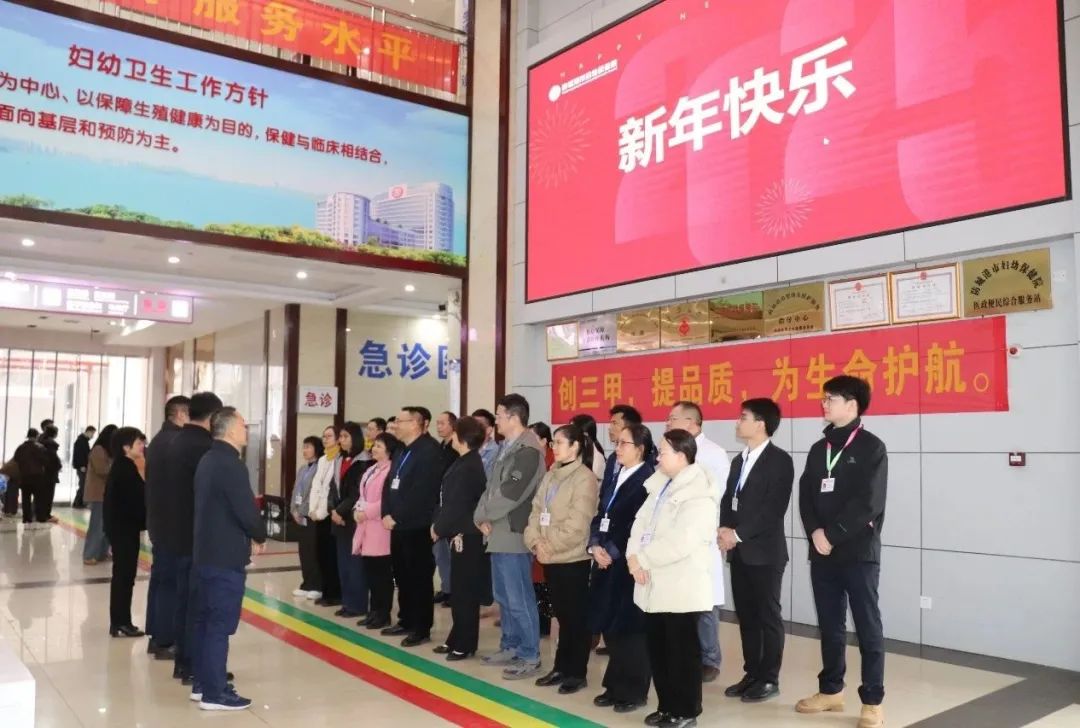岁寒情更暖,关怀暖人心。2月5日(正月初八),市卫生健康委主任戴三军、副主任韦启波、副主任唐凤禧、四级调研员劳剑峰一行到我院开展2025年春节走访活动,向我院全体职工致以美好的祝福和诚挚的问候。在门诊一楼大厅,戴三军主任对过去一年我院医护人员的辛勤付出和无私奉献给予了高度评价。并指出,过去的一年,医院在医疗质量、服务水平、学科建设等方面都取得了显著的成绩,这些成绩的取得离不开每一位职工的努力付出。同时,也希望大家在新的一年里,继续发扬敬业奉献的精神,不断提升医疗技术水平,为患者提供更加优质、高效、便捷的医疗服务,推动医院各项工作迈上新台阶,助力三级甲等妇幼保健院创建再上新进程。