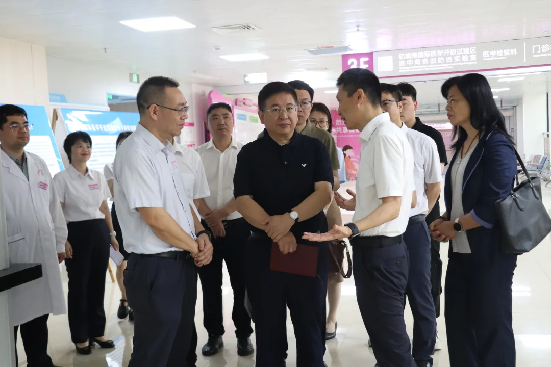 4月9日,自治区卫生健康委党组成员、副主任周恭伟,自治区卫生健康委科教处副处长黄东明等调研组一行7人莅临防城港市妇幼保健院开展防城港国际医学开放试验区地中海贫血防治实验室、防城港国际医学开放试验区地中海贫血移植仓运行专题调研。防城港市委常委、副市长陈光炯,防城港市卫生健康委员会党组成员、副主任黄忠辉,防城港市妇幼保健院院长赖添武等陪同调研。