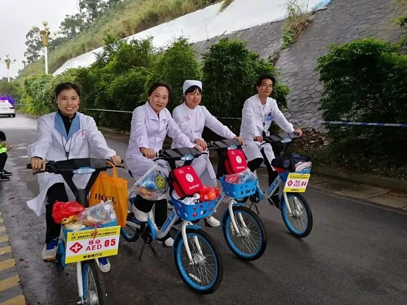 市妇幼保健院在18-20km处AED移动医疗点上的医务人员,他们说:“可以享受免费的哈罗单车了”。