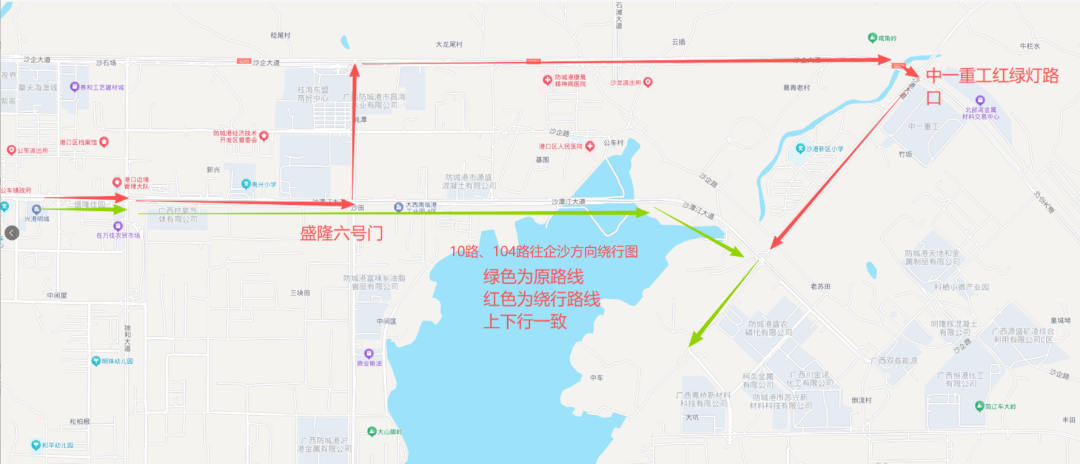 调整后往企沙方向从小龙门路绕行沙企大道、中一重工(红绿灯)路口驶入沙港大道往化工厂路段、光坡方向行驶至大龙村站点绕行沙企大道到企沙镇,不经过港口区人民医院站点;上下行一致。(详见绕行线路图)