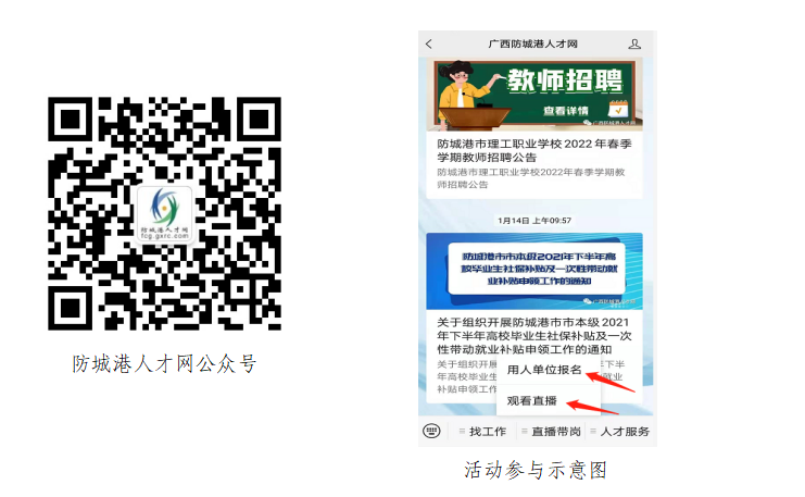 (一)用人单位报名:1.登录防城港人才网(https://fcg.gxrc.com),点击横幅“2022年防城港市“春风行动”系列直播带岗活动”图标,进入本场招聘会专题页继续点选“用人单位报名”图标,填写相关信息报名。防城港人才网的用人单位用户请直接用账号和密码登录报名,新用户请直接注册申请账号报名。2.扫描关注下方二维码,点击“直播带岗”—“用人单位报名”,根据提示进行线上报名,工作日内提交材料完成后,工作人员将在24小时内审核并电话联系确认。