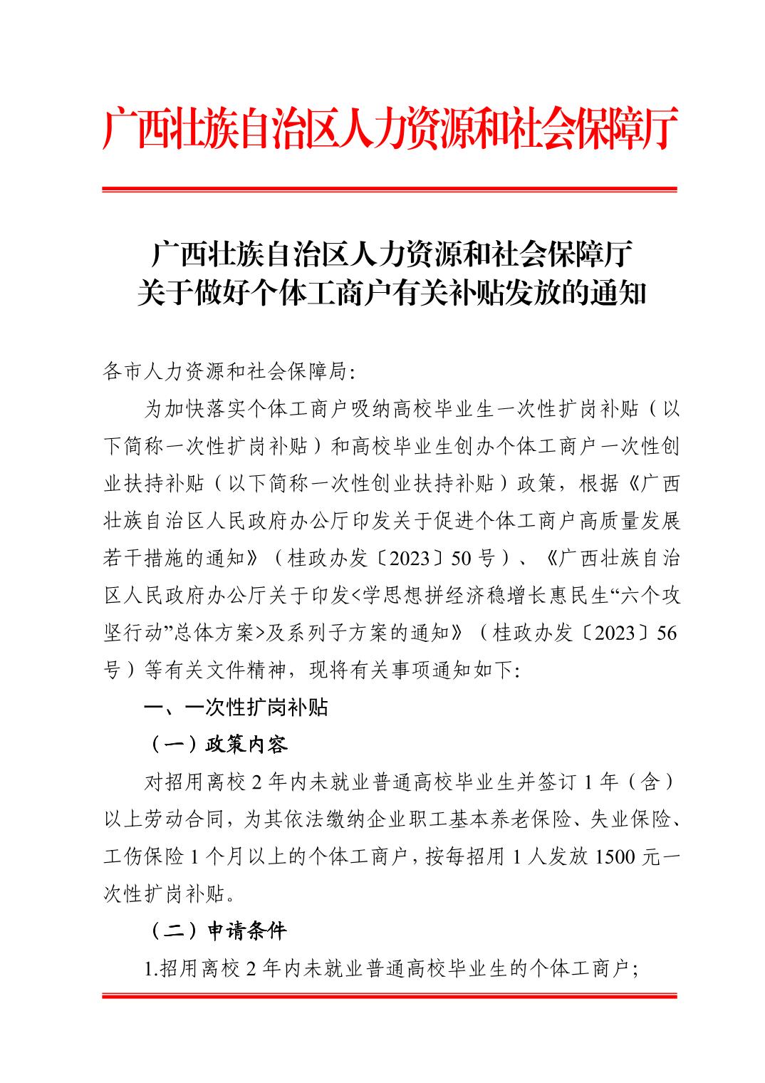 广西壮族自治区人力资源和社会保障厅关于做好个体工商户有关补贴发放的通知