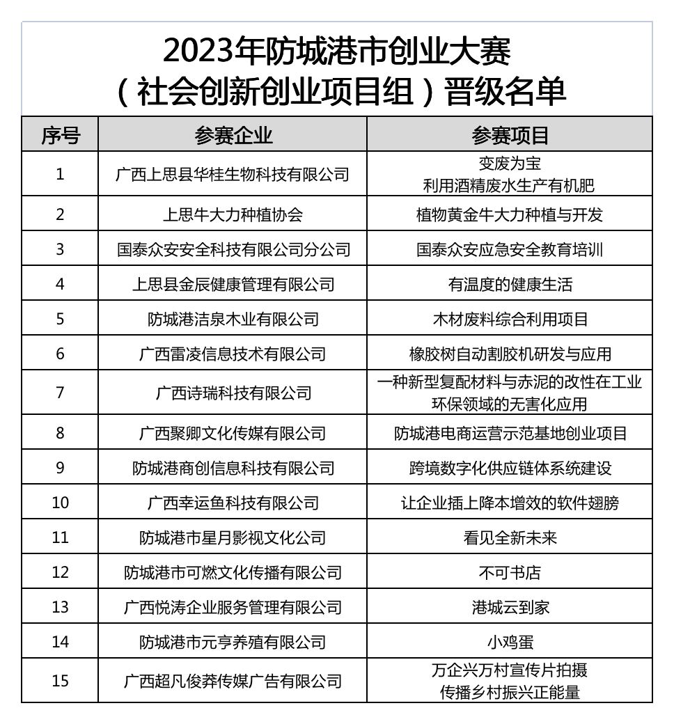 现将拟决赛名单公布如下,如有异议,请在公示期内将书面材料反馈至2023防城港市创业大赛组委会办公室邮箱。