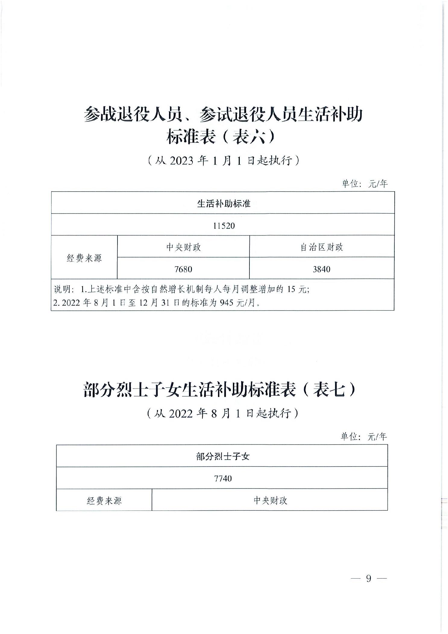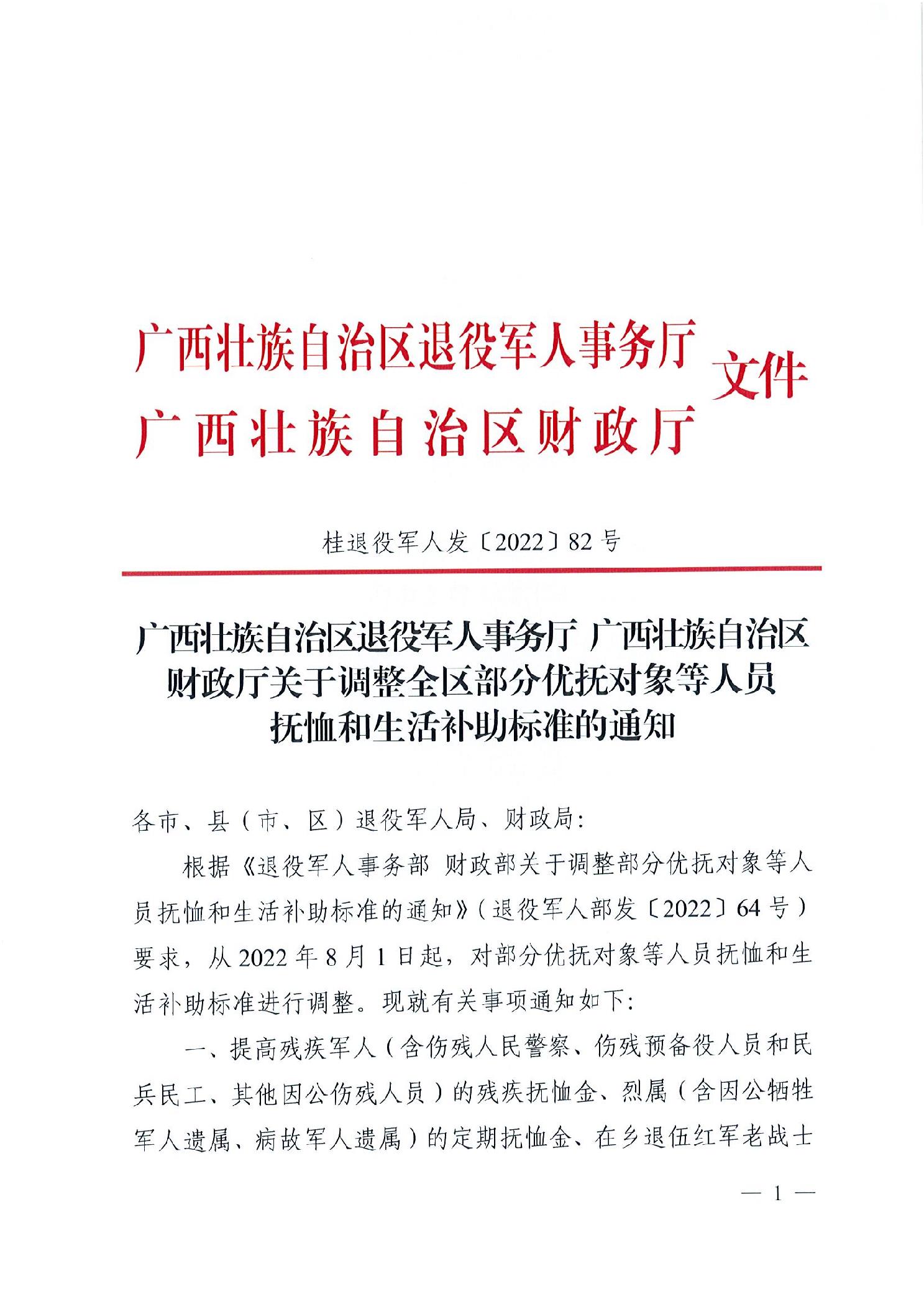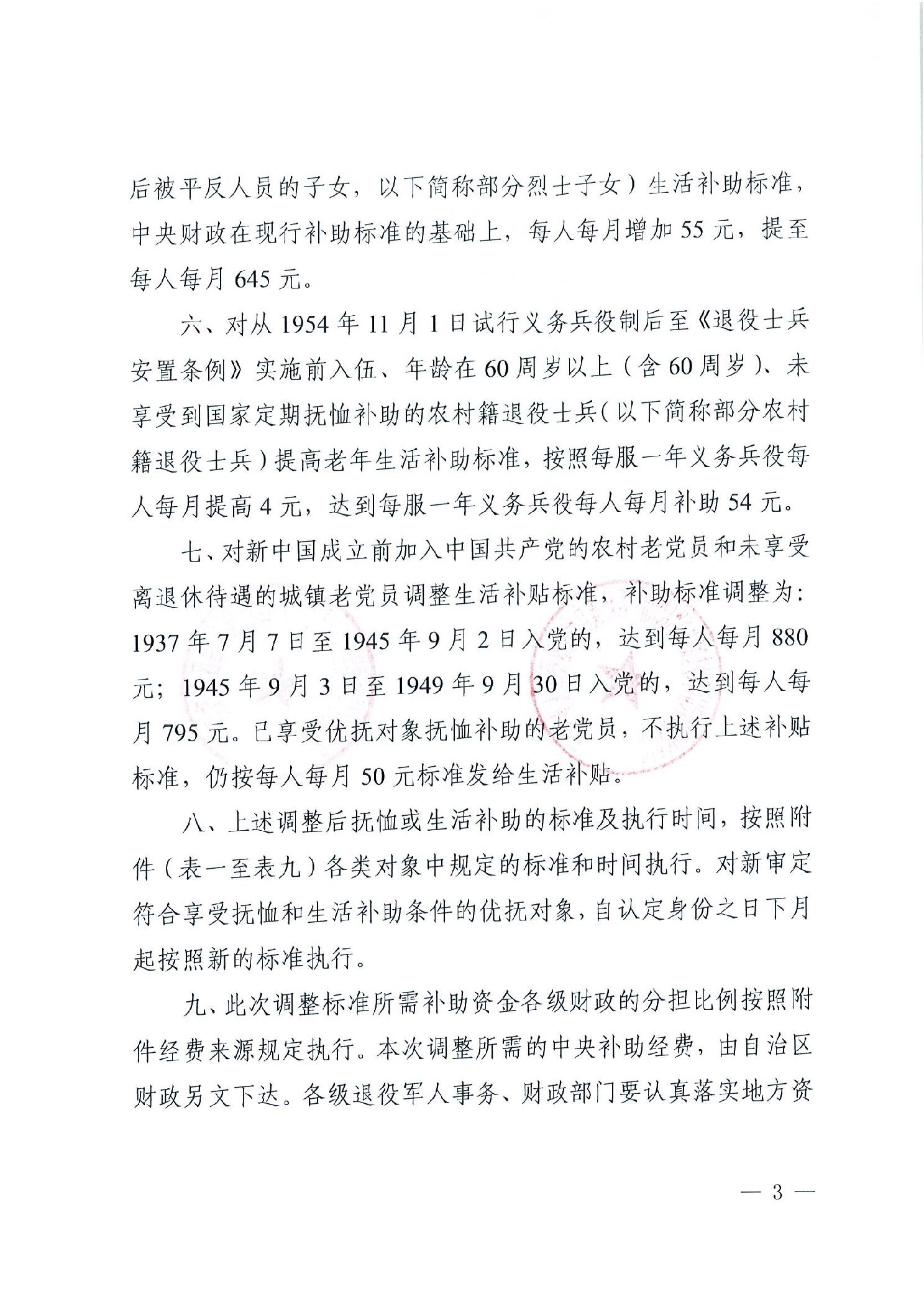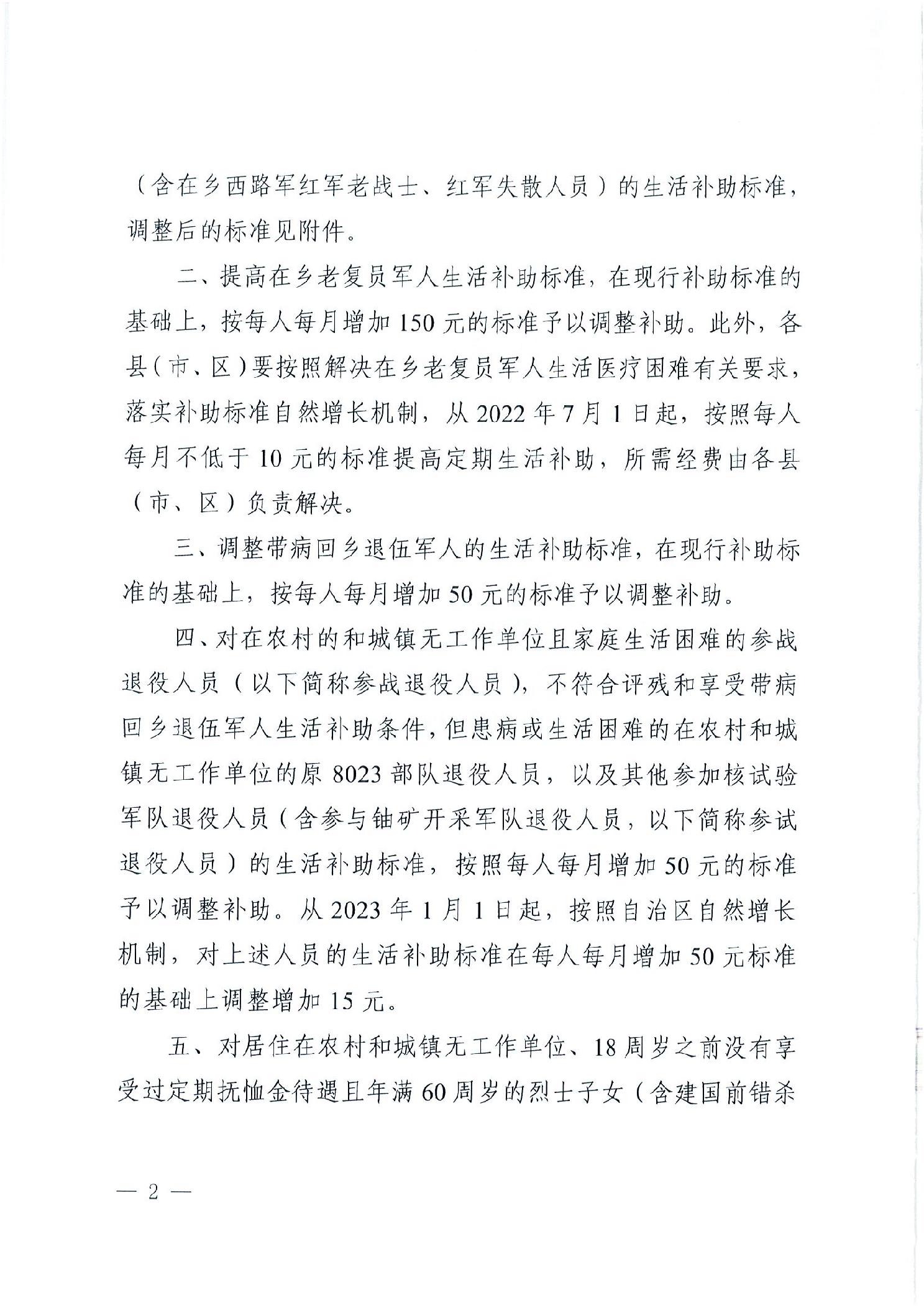 关于调整全区部分优抚对象等人员抚恤和生活补助标准的通知