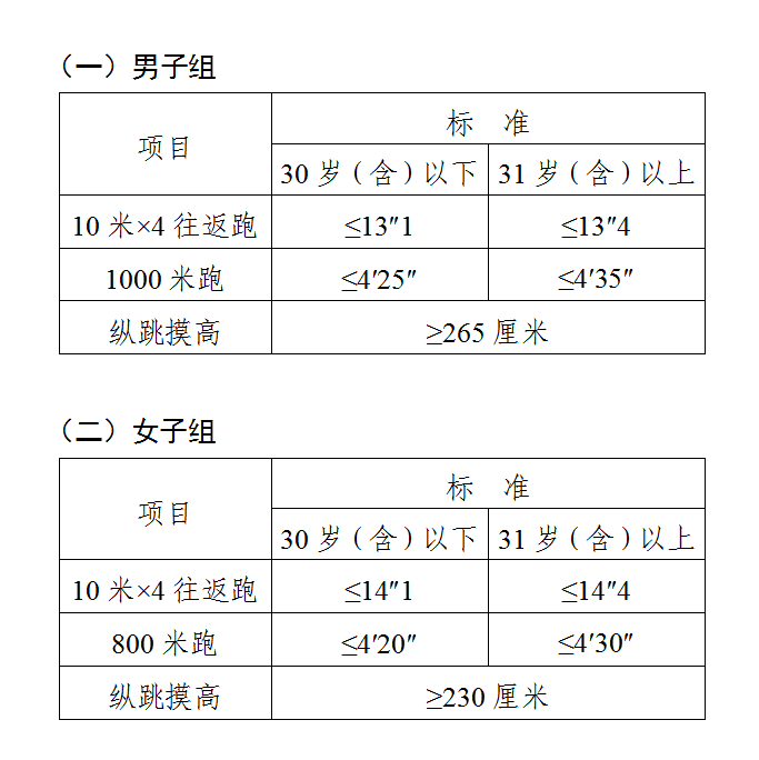 备注:综合管理、执法勤务职位测查全部3个项目,警务技术职位免予测查1000米(男)/800米(女)跑项目;对专业人才紧缺难以形成竞争的特殊职位,经省级以上公务员主管部门同意,可以适当放宽体能测评有关项目标准或者免予测查体能测评项目;凡应测项目中任意一项不达标的,即为体能测评不合格。年龄计算时间截止到参加体能测评当月。
