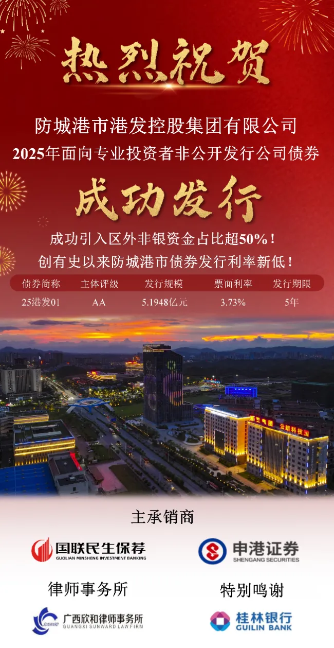 港发集团于2025年4月24日成功发行防城港市港发控股集团有限公司2025年面向专业投资者非公开发行公司债券,发行规模5.1948亿元,发行期限5年,票面利率3.73%。