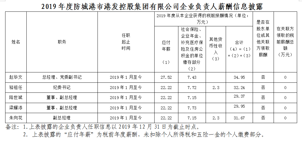 2019年度防城港市港发控股集团有限公司企业负责人薪酬信息披露