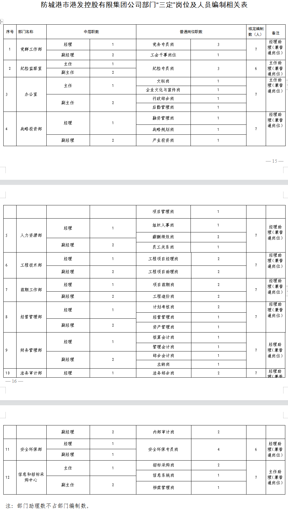 战略投资部核定编制7人,其中:经理1人,副经理2人,融资管理岗1人,战略规划岗1人,产业投资岗1人,项目管理岗1人。