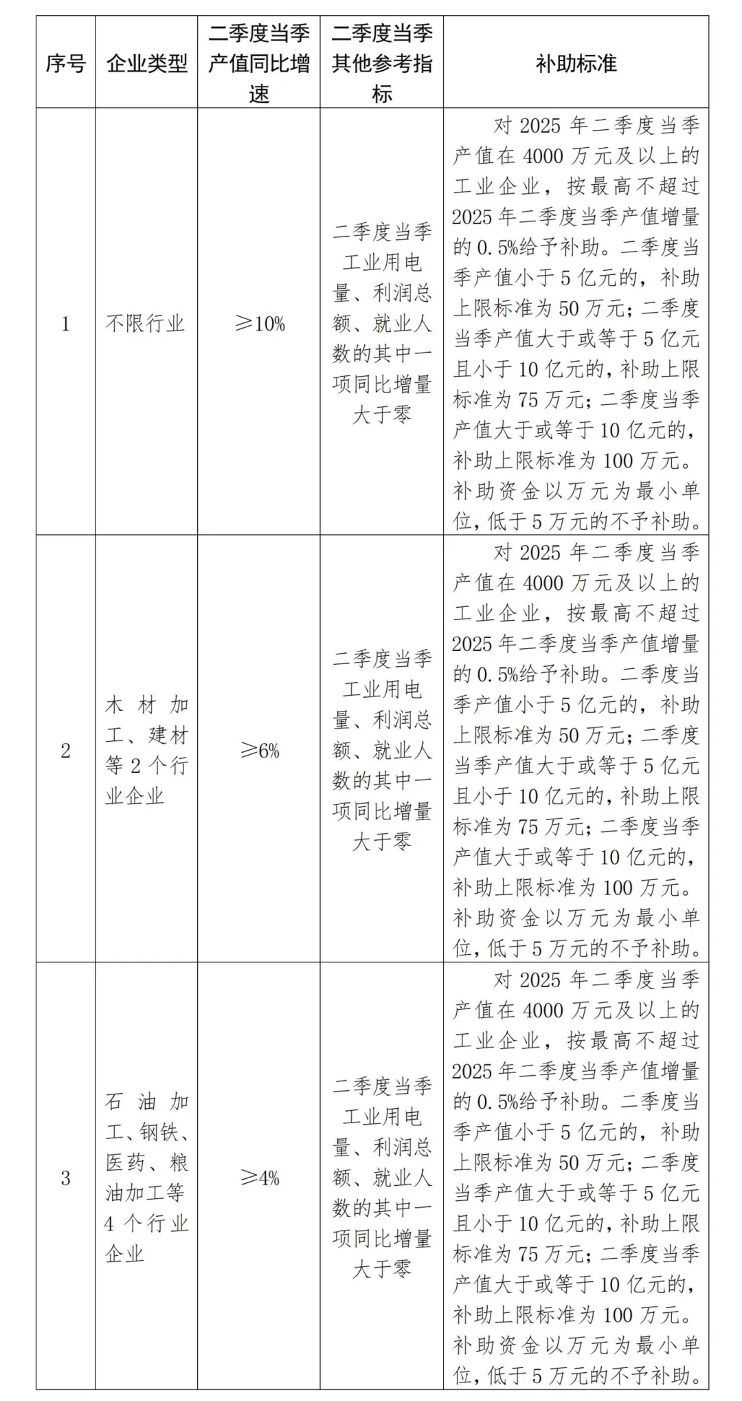 根据企业2025年二季度当季产值、工业用电量、利润总额、新增用工人数等指标情况,分行业分类给予企业一定的资金奖补(如下表),用于支持企业增加用工、采购生产物料、降低物流成本和加强安全生产等。注:以下各项不得重复申报,补助标准为上限标准。