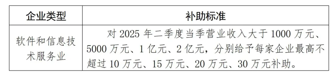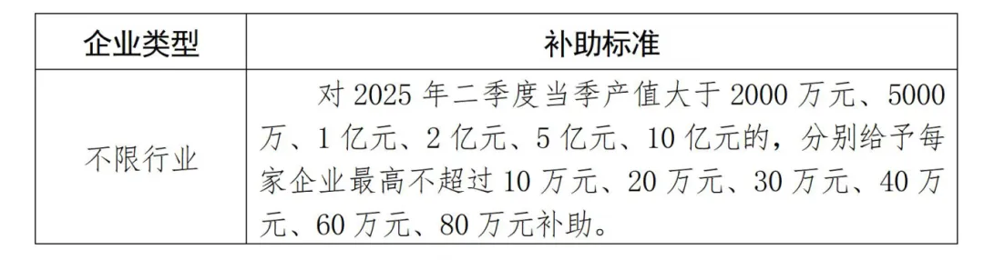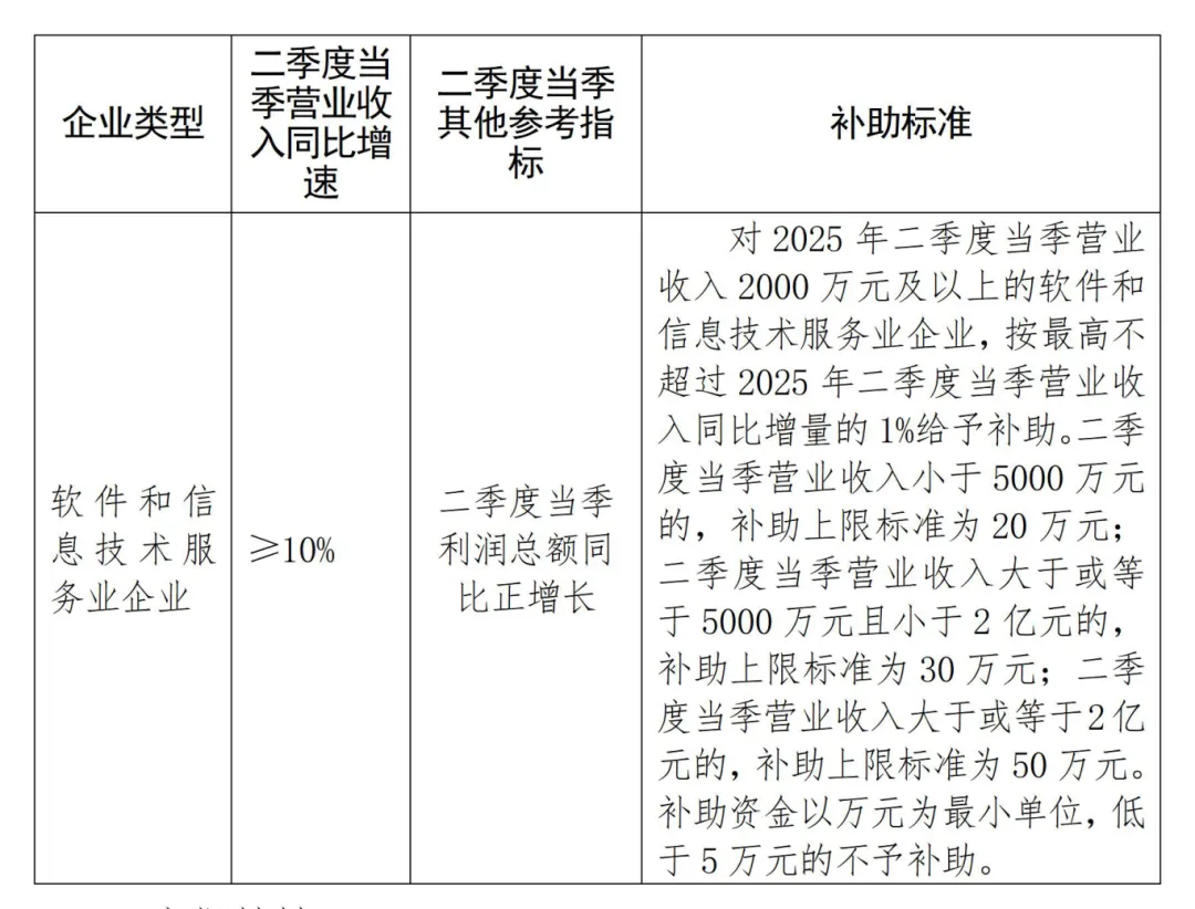 根据企业2025年二季度当季营业收入、利润总额等指标情况,给予企业一定的资金奖补,用于支持企业增加用工、软件开发、运维服务等。注:补助标准为上限标准。