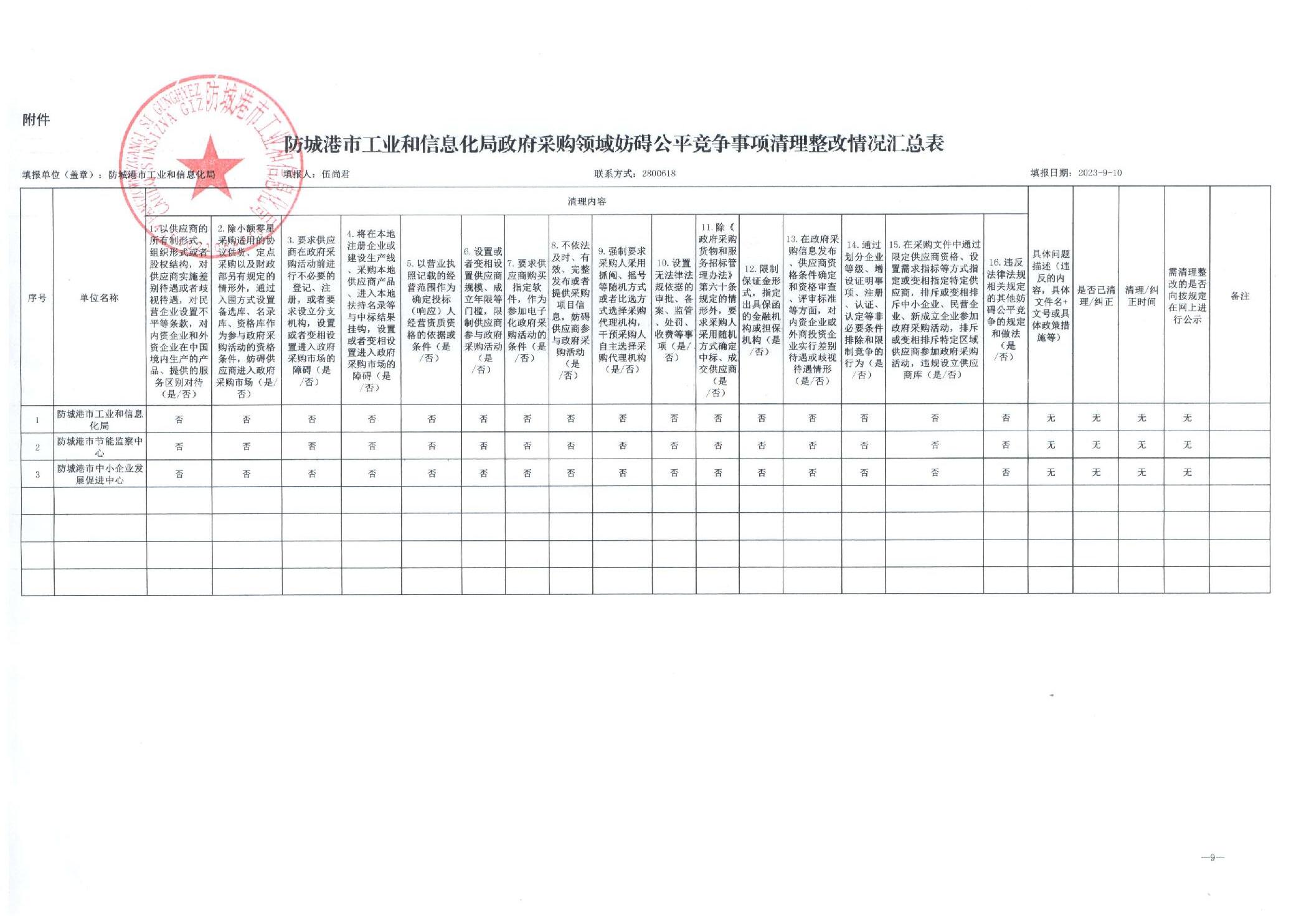 防城港市工业和信息化局政府采购领域妨碍公平竞争清理整改情况汇总表