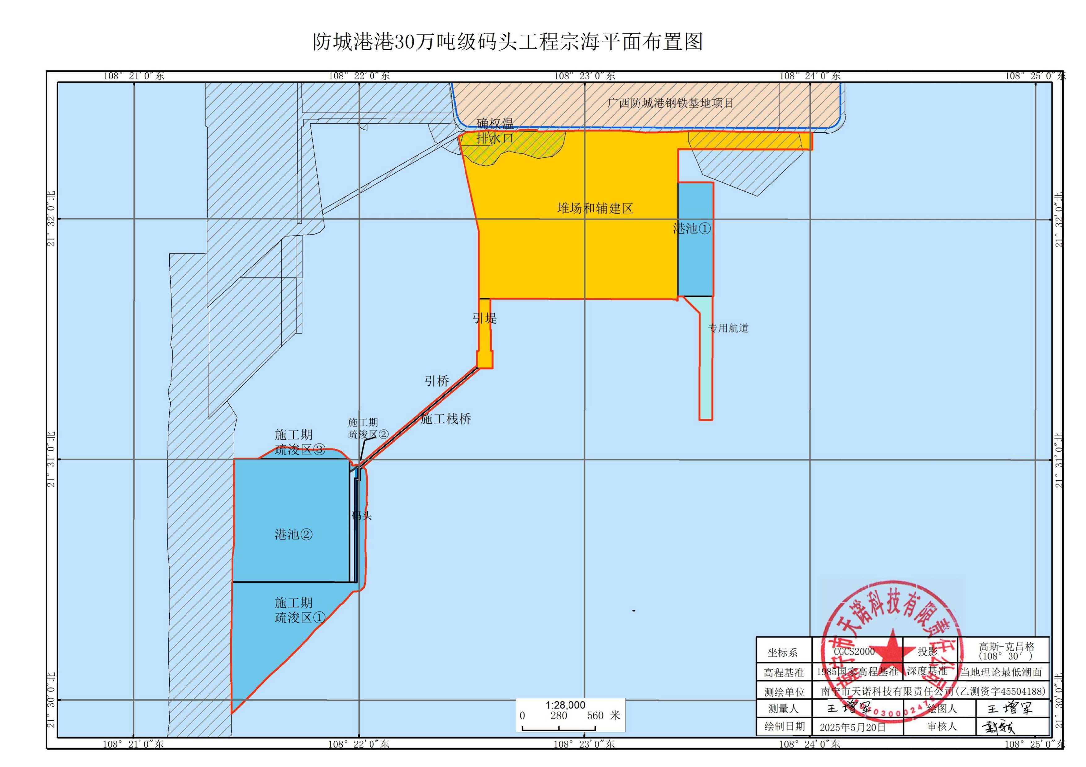防城港三牙码头有限公司拟申请用海建设防城港港30万吨级码头工程项目,项目用海位于防城港市企沙镇炮台村南部海域,用海总面积416.2201公顷(最终以海域使用论证通过的面积为准),用海类型为交通运输用海,用海性质为经营性用海。其中,码头、堆场和辅建区用海面积217.7031公顷,用海方式为“建设填海造地”;引堤用海面积5.3360公顷,用海方式为“非透水构筑物”;码头和引桥用海面积5.5474公顷,用海方式为“透水构筑物”;专用航道用海面积10.3197公顷,用海方式为“专用航道、锚地”;港池用海面积111.5501公顷,用海方式为“港池、蓄水”;施工栈桥用海面积3.5547公顷,用海方式为“透水构筑物”,施工期疏浚区用海面积62.2091公顷,用海方式为“港池、蓄水”,除施工栈桥、施工期疏浚区作为施工用海,申请用海期限5年外,其余区域申请用海期限50年。