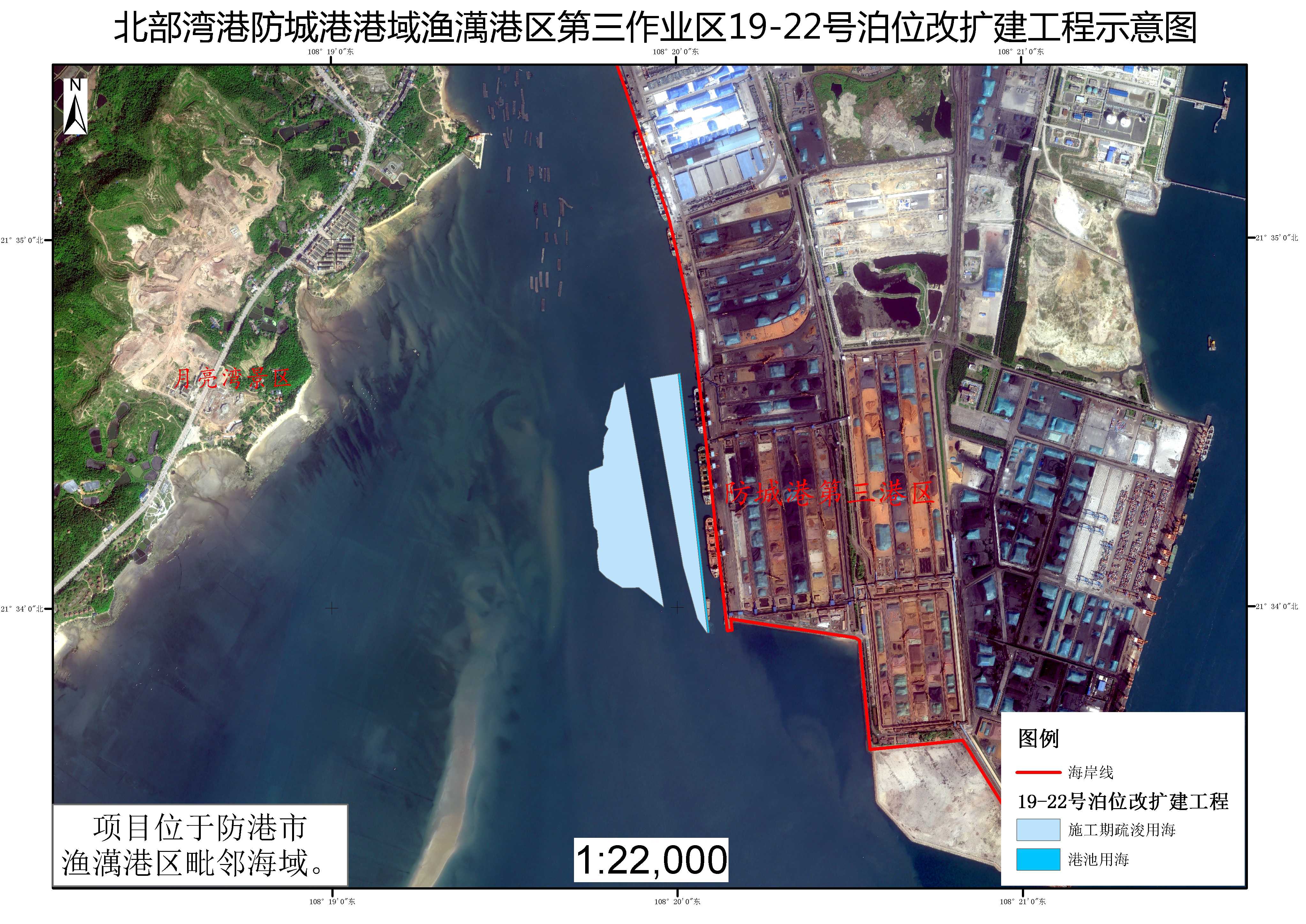 我局拟出让位于防城港市渔澫港区毗邻海域(位置坐标为:108°20′2.170″E,21°34′23.384″N)的1宗交通运输用海,总面积为35.8703公顷(最终以海域使用论证通过的面积为准),用海类型为交通运输用海,用海方式为港池、其他开放式用海,其中港池用海1.3225公顷,用海年限35年;其他开放式用海34.5478公顷,用海年限1年;用于北部湾港防城港港域渔澫港区第三作业区19-22号泊位改扩建工程建设,用海性质为经营性用海。根据《中华人民共和国海域使用管理法》等有关规定,现将该用海情况予以公示,如有异议,请在公示之日起二十日内向我局提出书面意见。如无异议或异议不成立,将按有关规定办理用海手续。