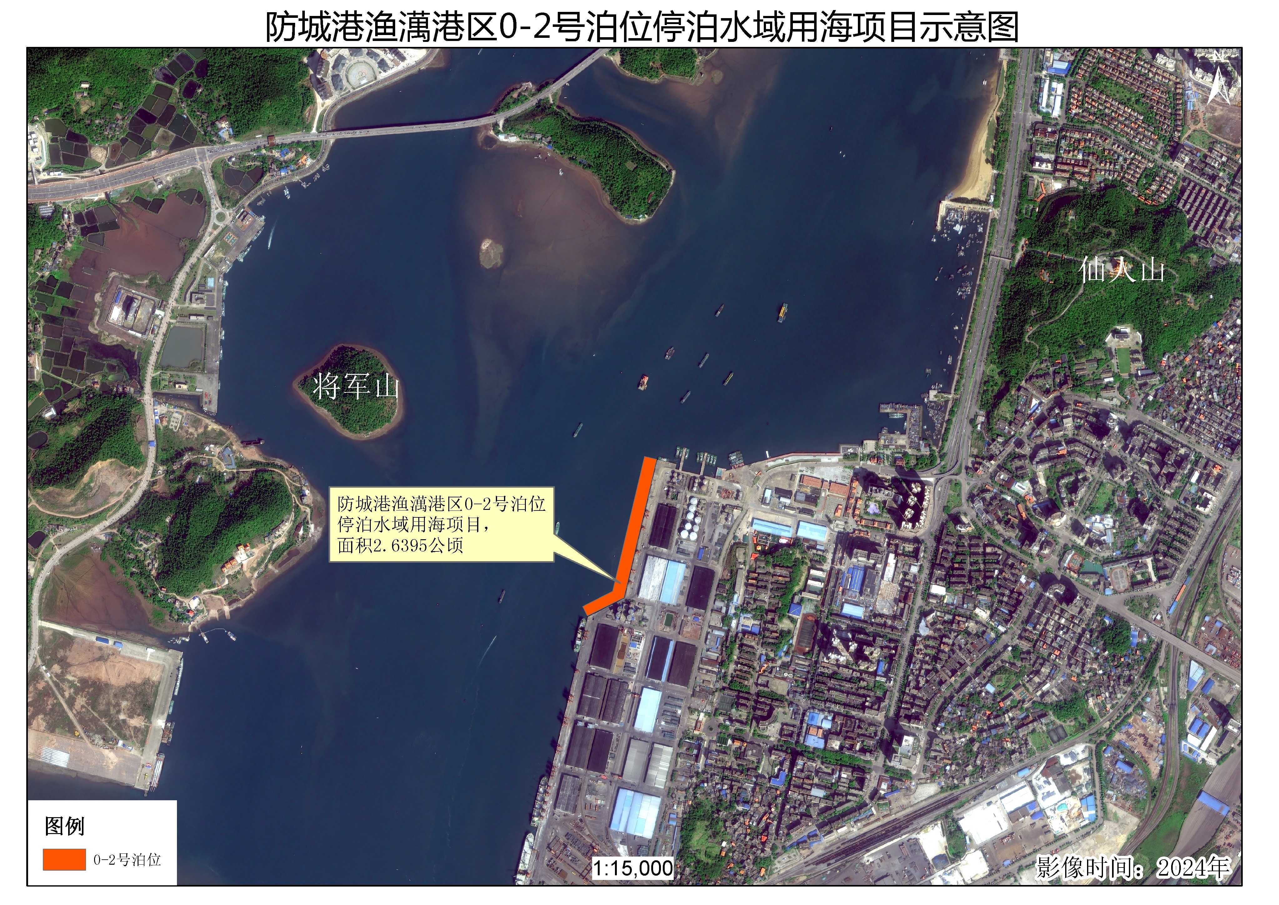 我局拟出让位于防城港渔澫港区0-2号泊位的1宗港池用海海域使用权,用海面积2.6395公顷(最终以海域使用论证报告为准),用海类型为交通运输用海,用海方式为港池、蓄水用海,用海年限为37年(截至2062年7月15日)。