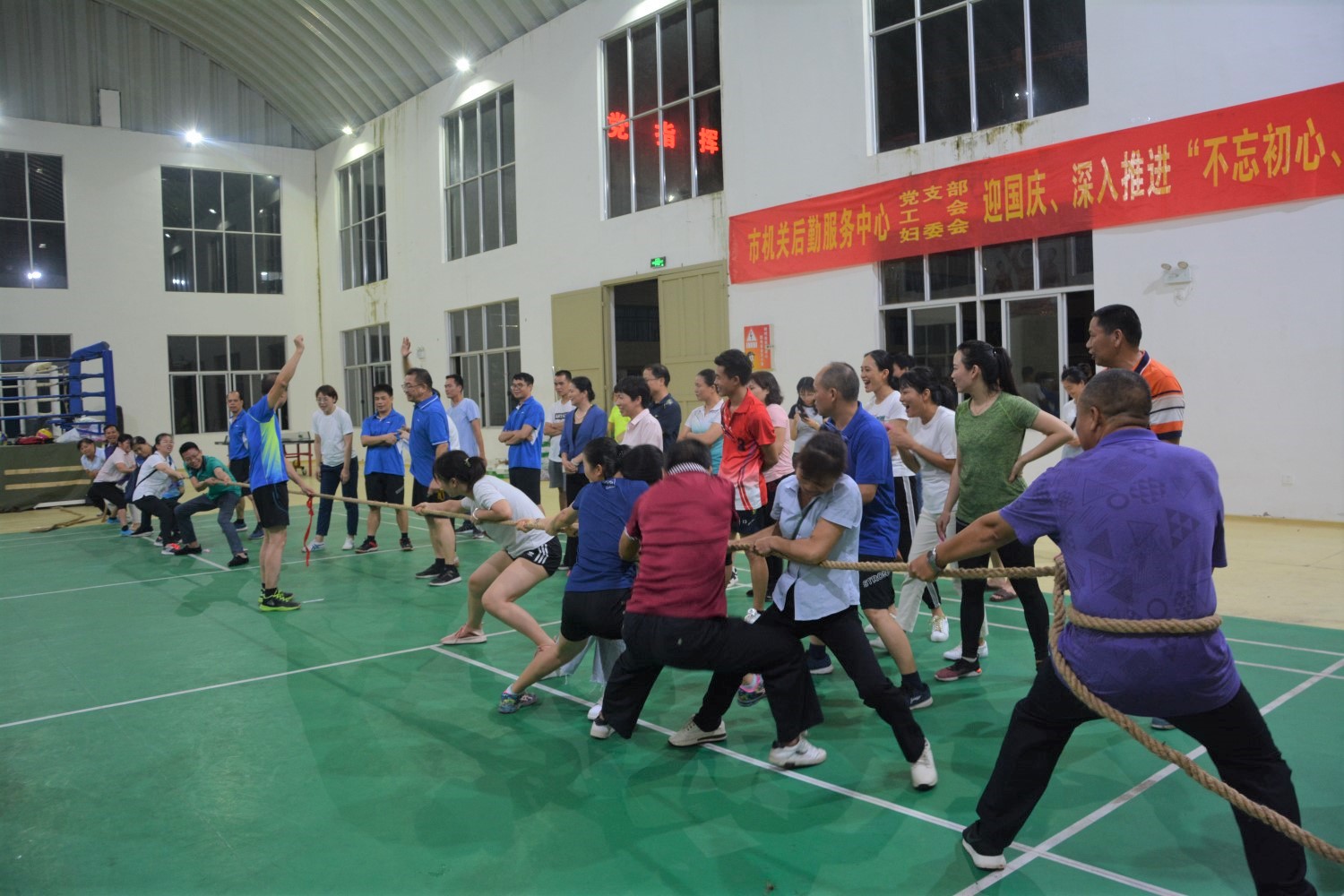 活动内容有三项,由中心领导分别主持进行。第一项是知识答题比赛,比赛以科室为单位进行,围绕党的十九大、习近平总书记重要讲话和“不忘初心、牢记使命”主题教育以及党建、工会、妇委会等知识进行,分必答和抢答两个环节,答题现场争先恐后,你追我赶,氛围浓厚;第二项是拔河比赛,参加活动的全体人员抽号组成8支参赛队伍进行了循环比赛,现场鼓劲加油的欢呼声不绝于耳,十分热闹;第三项是汽排球比赛,各科室组成两个参赛队,由中心领导分别带队进行交流比赛,队员们积极上场,顽强拼搏,口哨声、喝彩声、欢笑声回荡在整个赛场上。