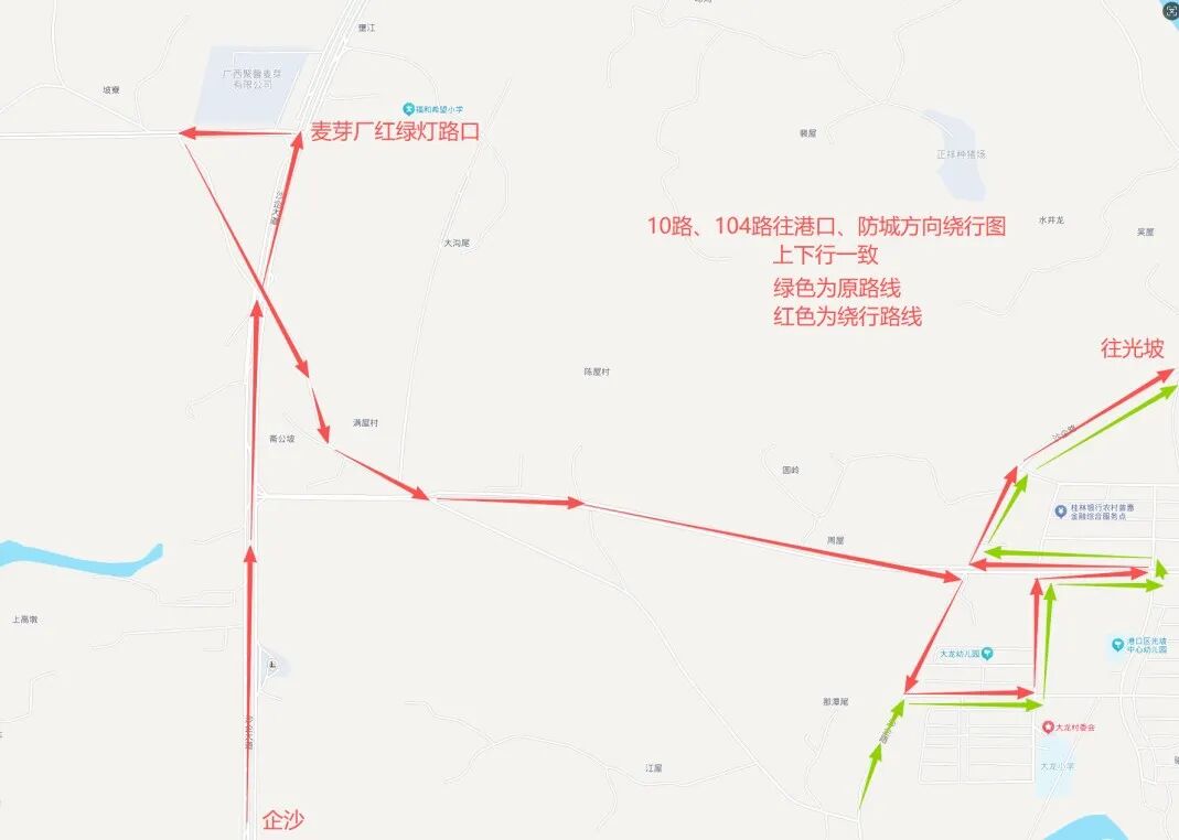 调整后往企沙方向从小龙门路绕行沙企大道、中一重工(红绿灯)路口驶入沙港大道往化工厂路段、光坡方向行驶至大龙村站点绕行沙企大道到企沙镇,不经过港口区人民医院站点;上下行一致。(详见绕行线路图)