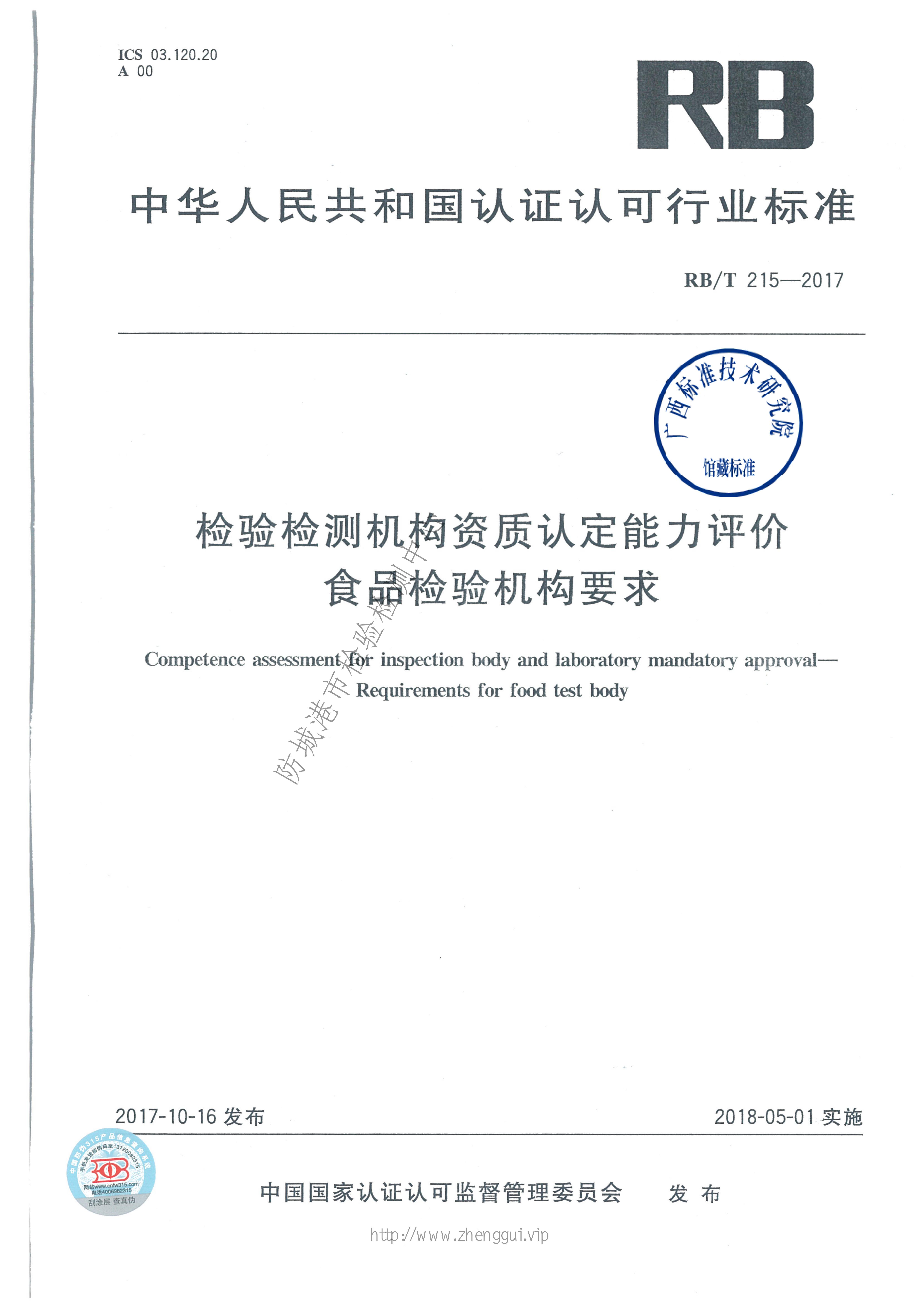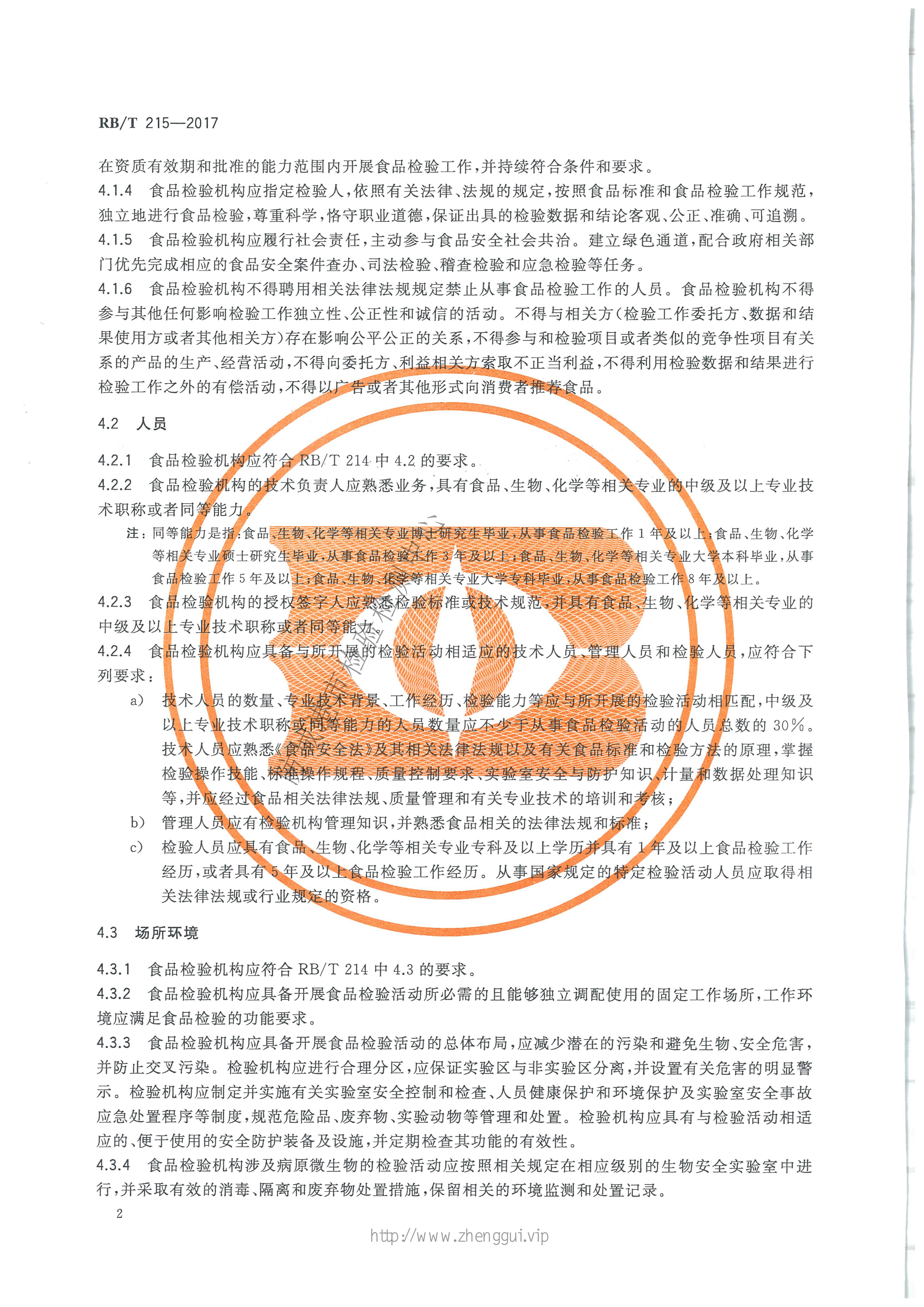 RB/T 215-2017检验检测机构资质认定能力评价 食品检验机构要求