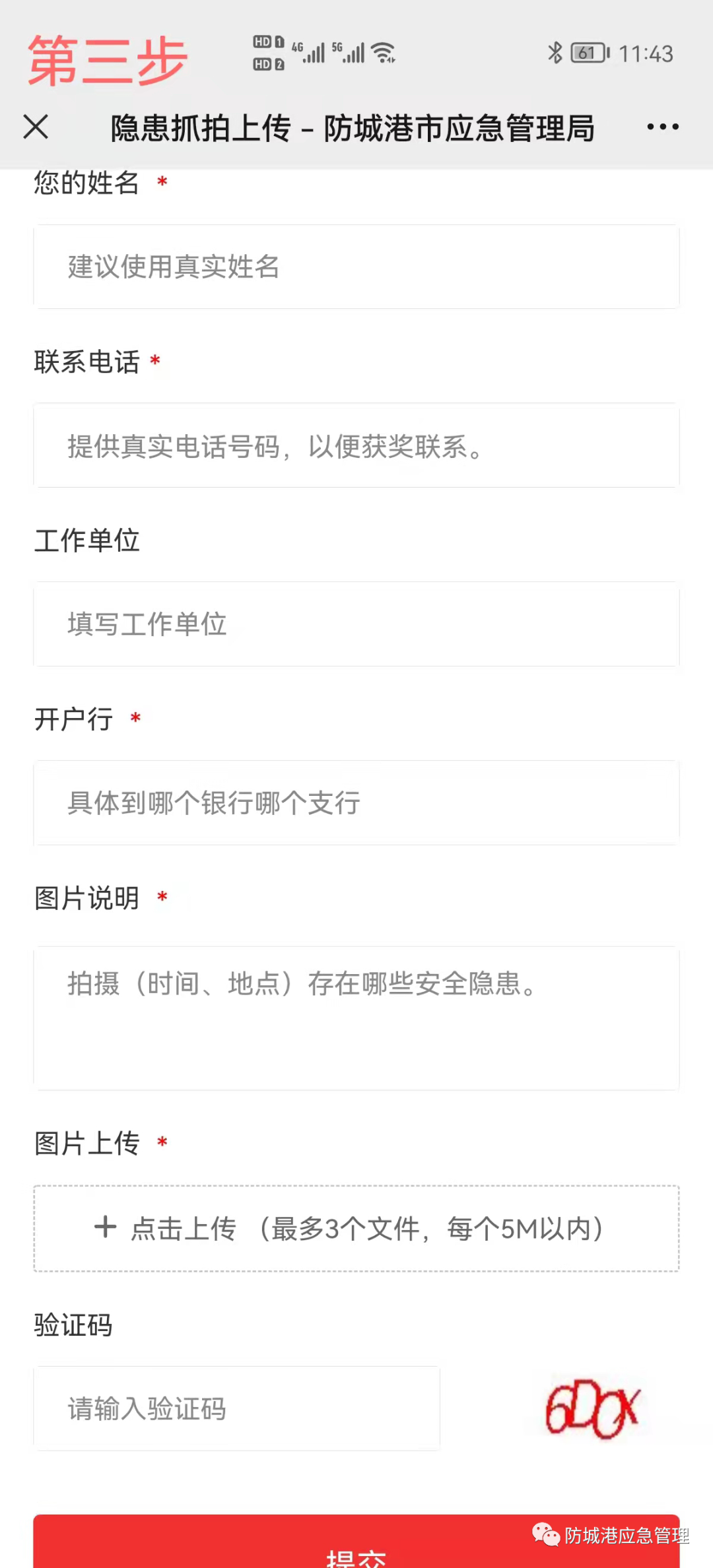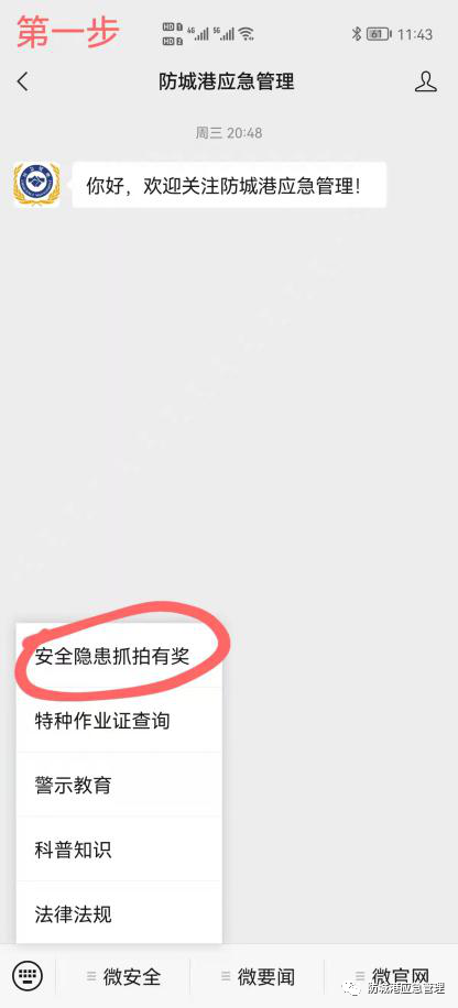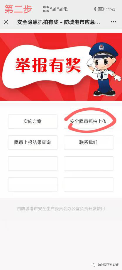 2.在微信上搜索并关注“防城港应急管理”公众号,进 入公众号“防城港应急管理”的“微安全”栏目,点击在 最上一栏“安全隐患举报有奖”,上报如下图所示: