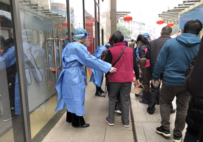 图为:防城港市民政局志愿者引导群众进行核酸采样。