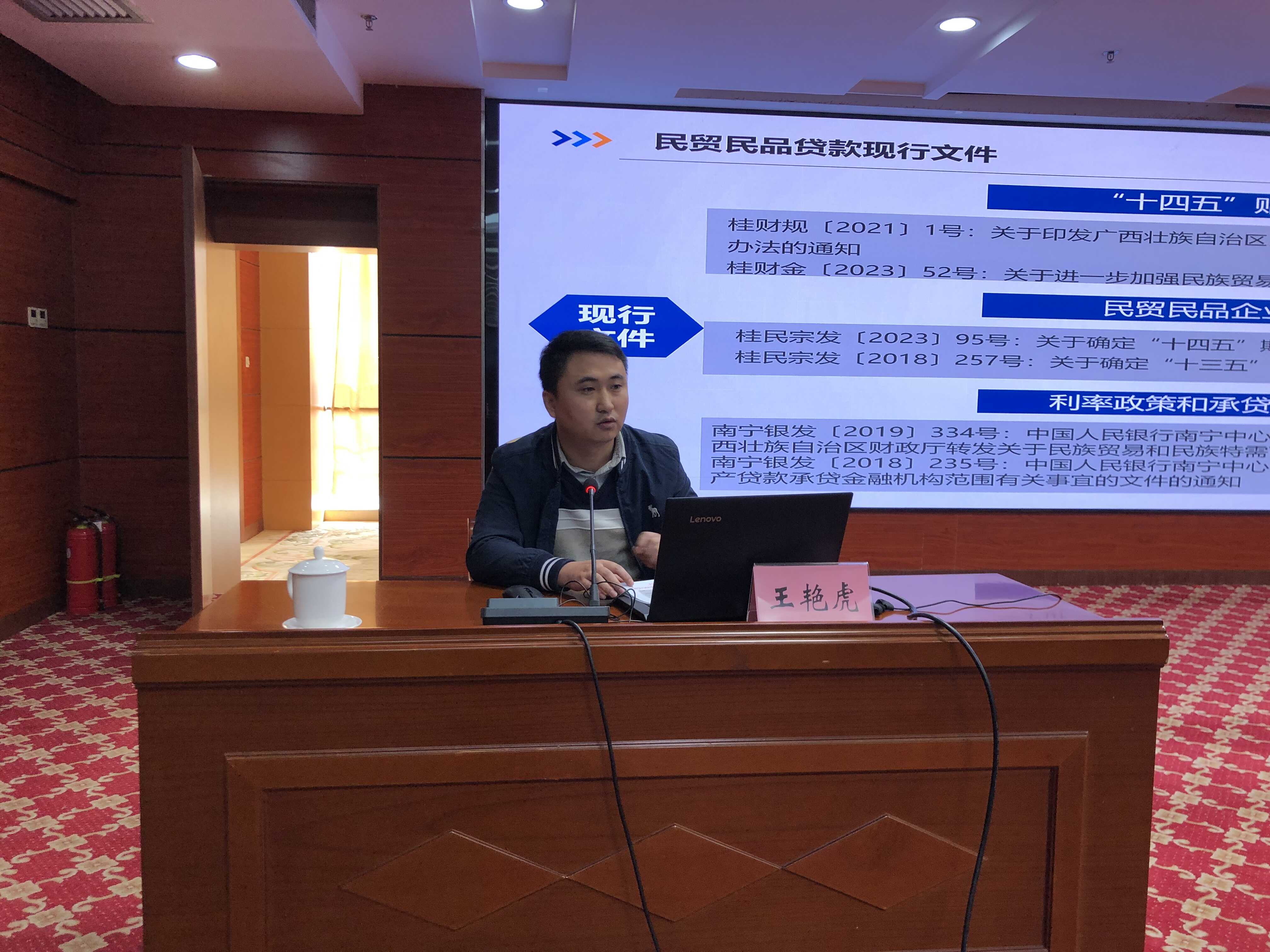 本次培训班邀请了自治区民宗委经济发展处处长覃凤前,中国人民银行防城港分行领导就扶持民贸民品企业优惠政策、民贸民品贷款及贴息资金申请等方面进行专题授课及解读。