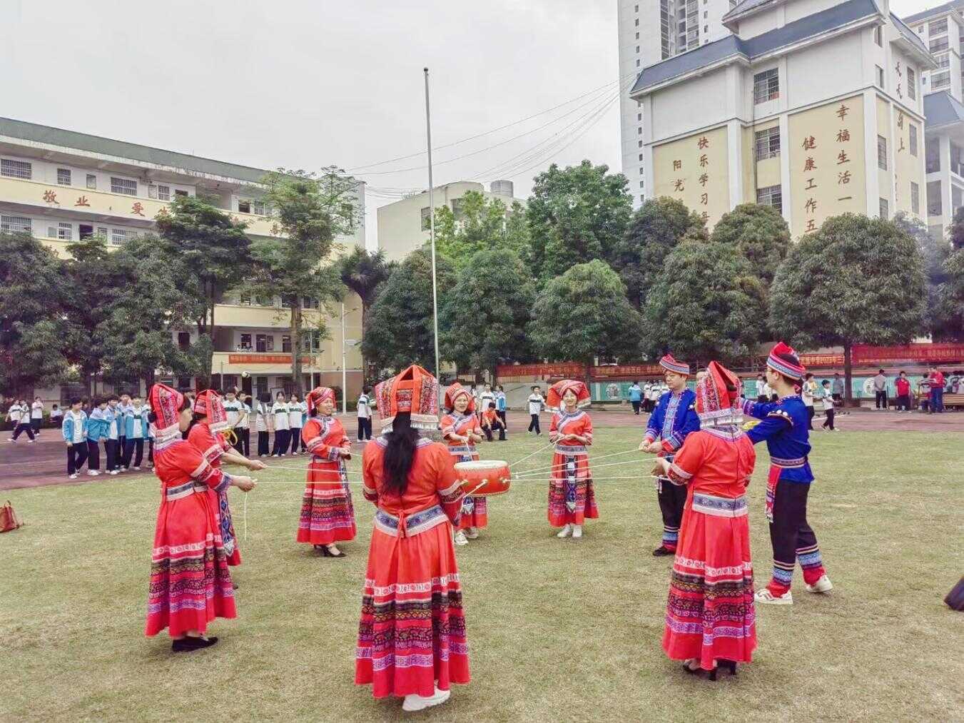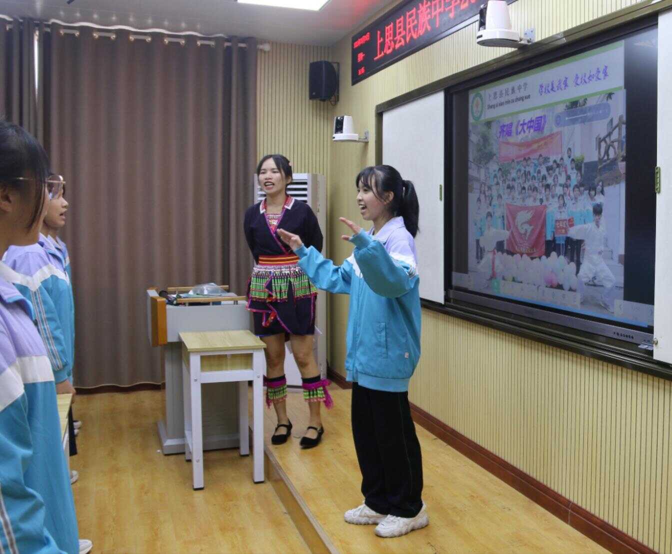 该中学还坚持传承和发展自治区级非物质文化保护遗产—上思舞鹿和上思“虽蕾(山歌)”,学校坚持开设舞鹿班和“虽蕾”班,让学生学习训练舞鹿技能和山歌创作及演唱技巧。学校坚持挖掘、传承民族体育运动,把抛绣球、竹竿舞、板鞋竞走、踩高跷等民族体育项目引进课堂。传统文化教育活动的开展,提振了师生的民族文化自信,为各族师生交往交流交融创造了条件。