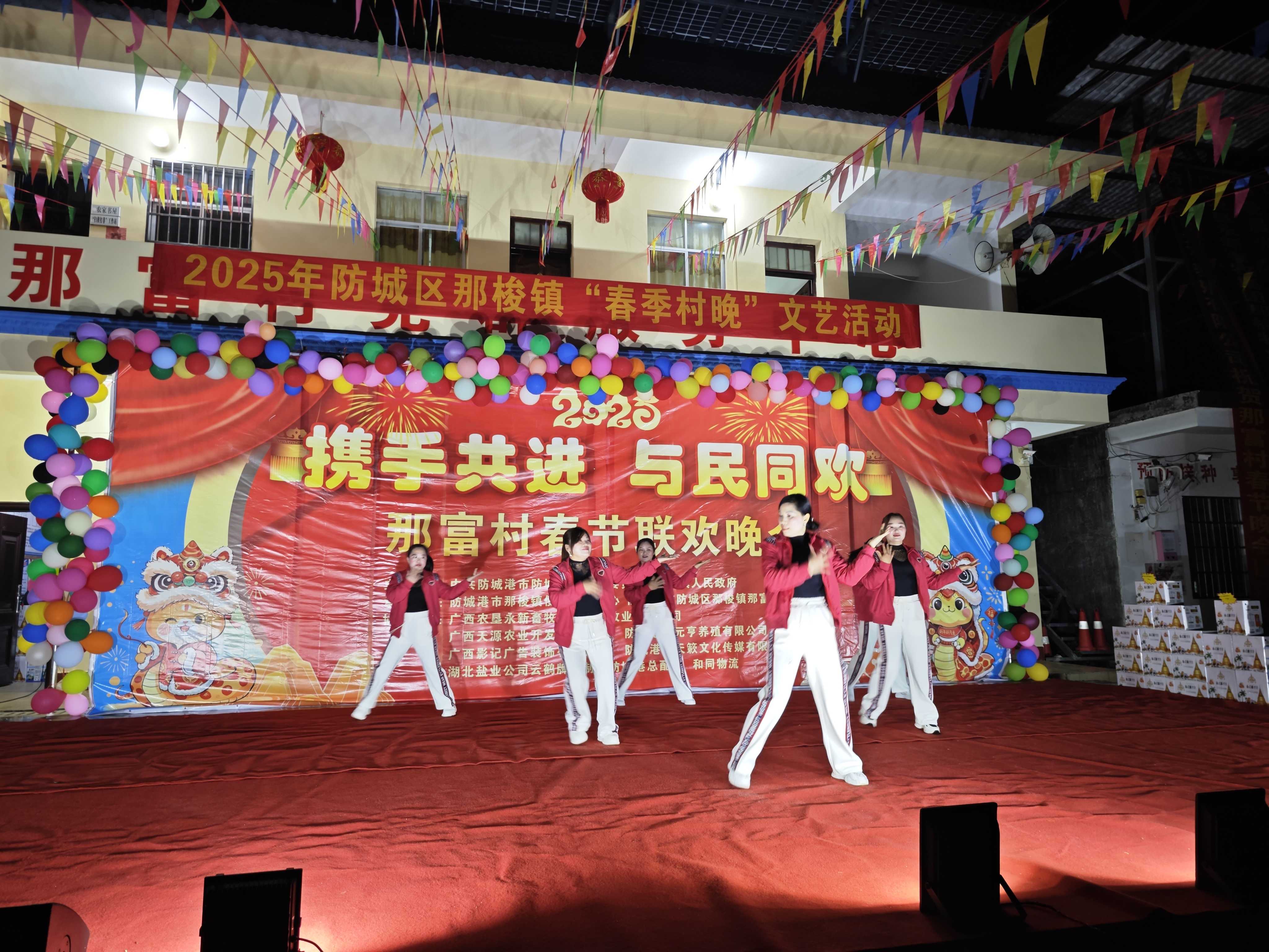 晚会在舞蹈《相亲相爱》中拉开序幕,寓意着各民族之间亲如一家。来自防城港市天簌管乐团、华石阳光舞蹈队、那梭文化站舞蹈队以及那富各村组的50多位演员轮番登台。舞蹈、红歌连奏、诗词朗诵、独唱、快板、萨克斯小号二重奏等节目精彩纷呈,每一个节目都饱含着各族群众对美好生活的赞美。欢快的舞步,舞出了村民们携手迈向美好生活的喜悦;动人的歌声,唱出了大家对祖国繁荣昌盛的美好祝愿,年味与民族情随着每一个音符、每一个舞步,弥漫在村子的每一个角落。