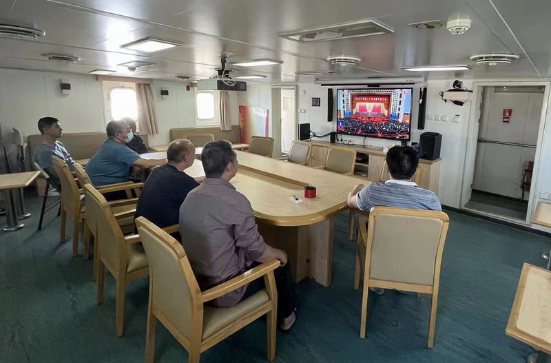 正在海上执勤的中国渔政执法船的一线执法人员收看直播